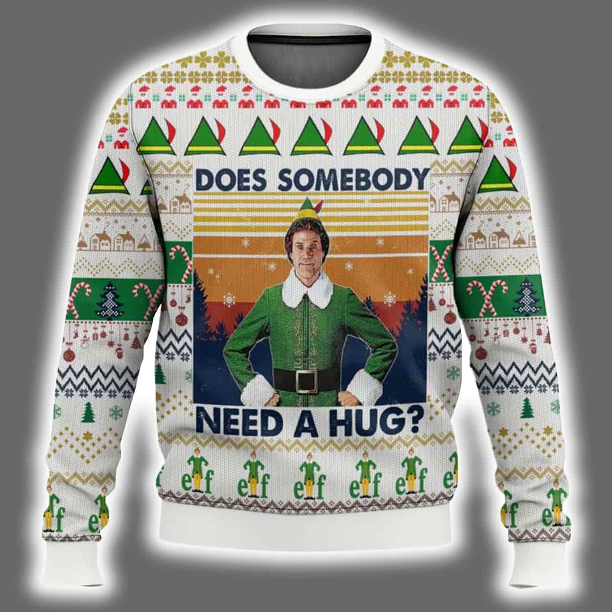 Buddy the Elf Is Back—Wrap Yourself in Hugs and Holiday Cheer with This Does Somebody Need A Hug Elf Ugly Christmas Sweater!