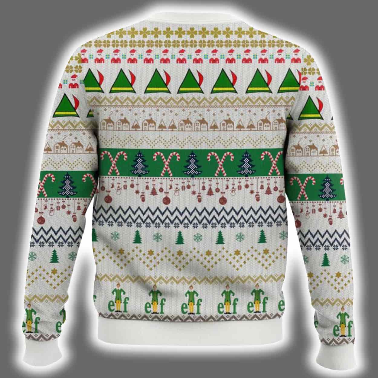 Get ready to sleigh the season with a sweater that’s bursting with joy, just like Buddy the Elf himself. Front and center stands Buddy, hands on hips, beaming with his signature enthusiasm. Above and below him, the cheerful phrase “DOES SOMEBODY NEED A HUG?” invites everyone to embrace the holiday spirit—literally. Surrounding Buddy is a flurry of festive patterns: candy canes, snowflakes, Christmas trees, and elf shoes, all arranged in playful rows that wrap around the sweater. The back continues the merry motif, making this a full-coverage celebration of all things jolly.