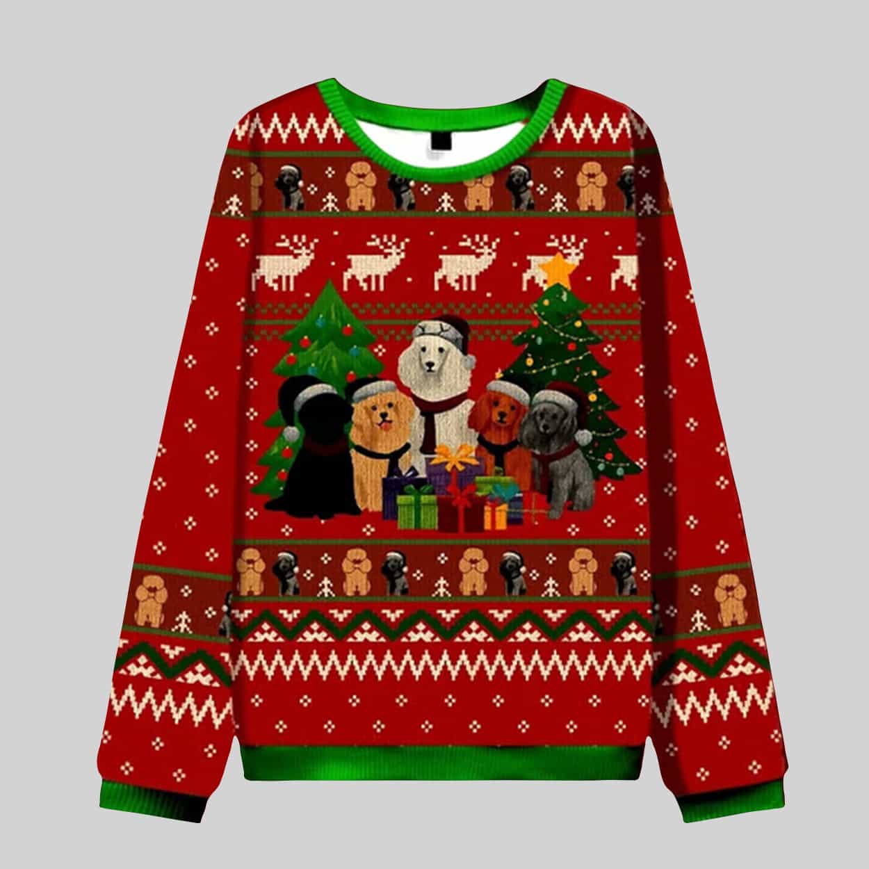 Get into the holiday spirit with this perfectly festive Dogs Gathering Ugly Christmas Sweater. This vibrant red pullover features a classic “ugly sweater” design with a bright green crewneck collar, cuffs, and hem. The charming centerpiece is an adorable gathering of dogs—including poodles, labradoodles, and golden doodles—wearing Santa hats, all clustered around Christmas trees and a pile of presents. The entire sweater is decorated with classic Fair Isle patterns, including rows of reindeer and silhouettes of poodles.