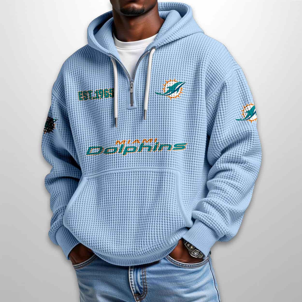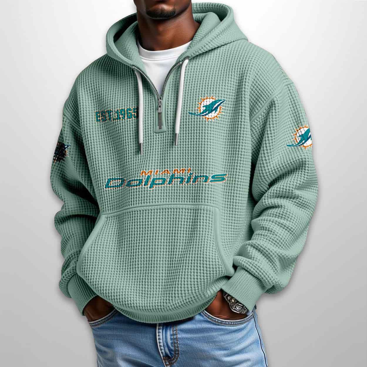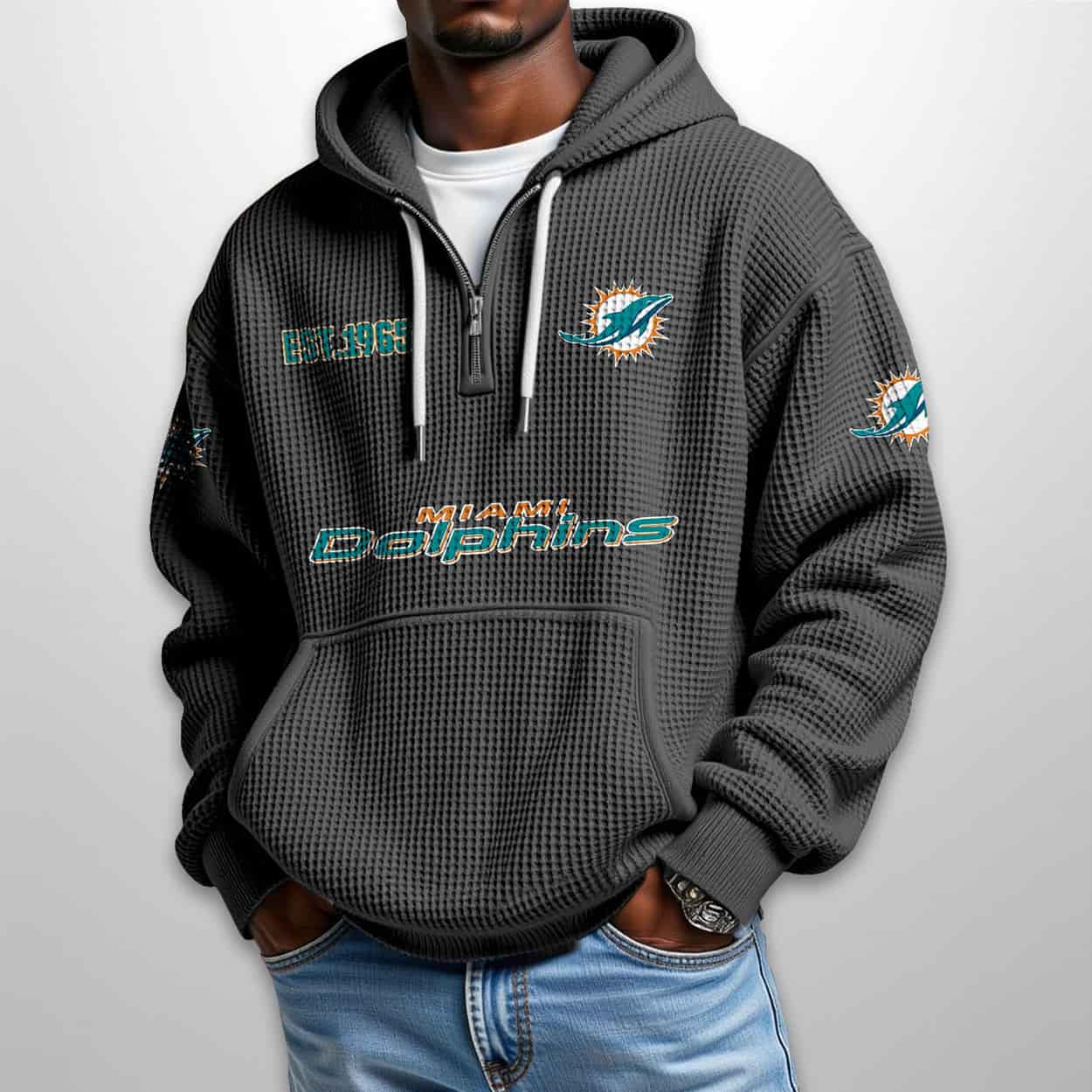 Ready to ride the wave of team pride? Zip into the Dolphins Est 1965 Half Zip Waffle Hoodie and let your style speak louder than a stadium cheer. Own the look. Own the legacy.