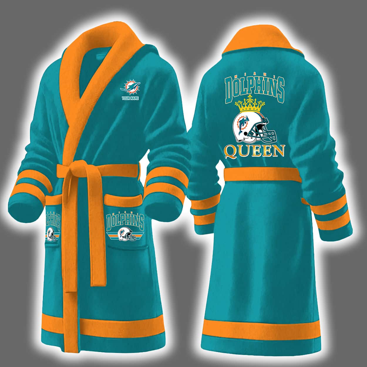 Ready to reign in teal and orange? Slip into the Dolphins Queen Personalized Bathrobe and let your fandom shine from the couch to the tailgate. Your kingdom awaits.