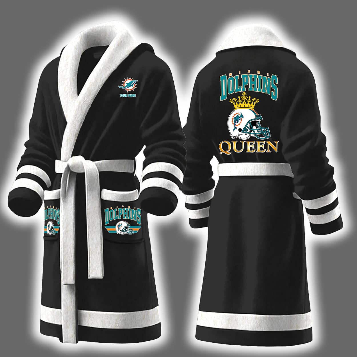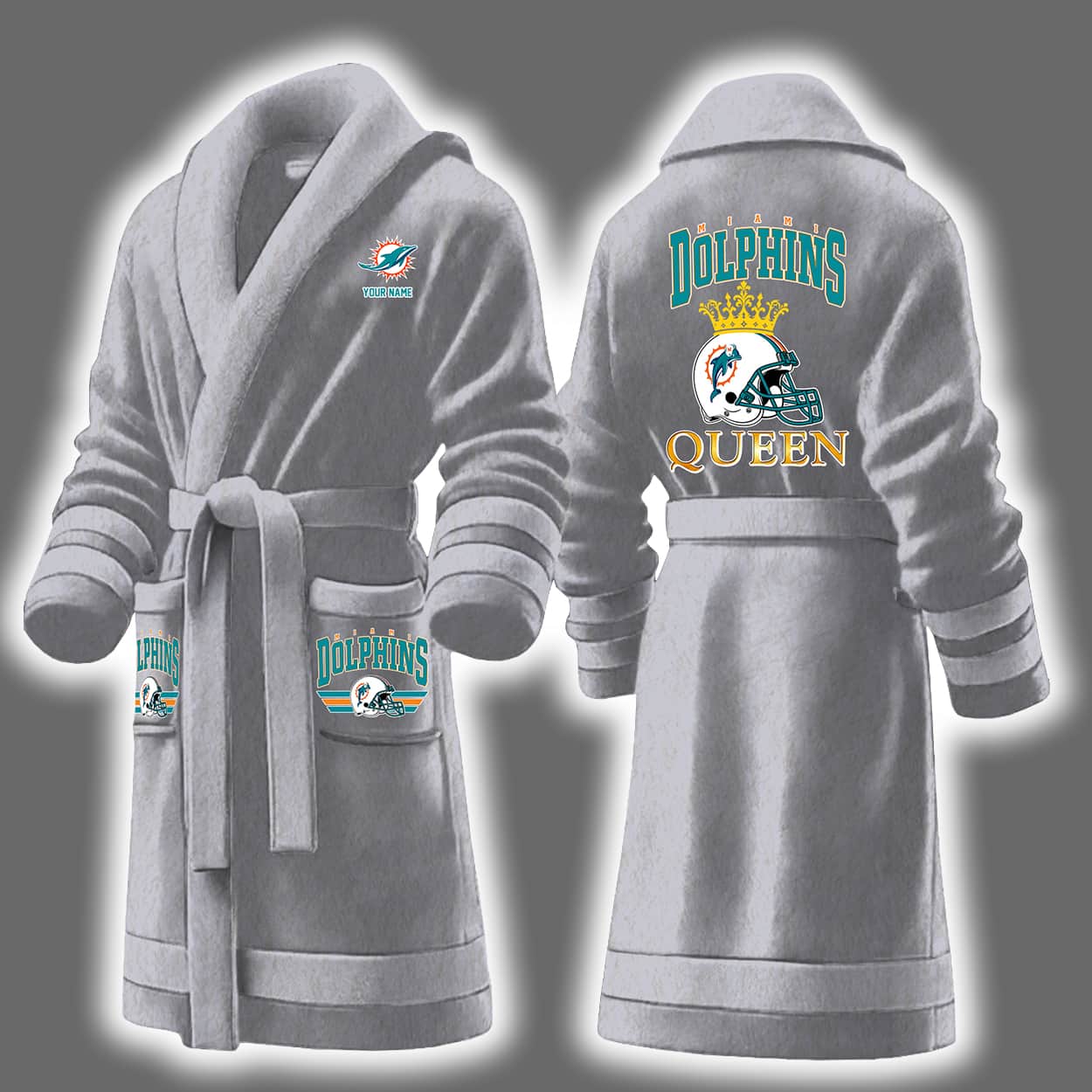 Make waves in style with the Dolphins Queen Personalized Bathrobe—where teal dreams meet gridiron glam. Designed for fierce Dolphins fans who love lounging like royalty.