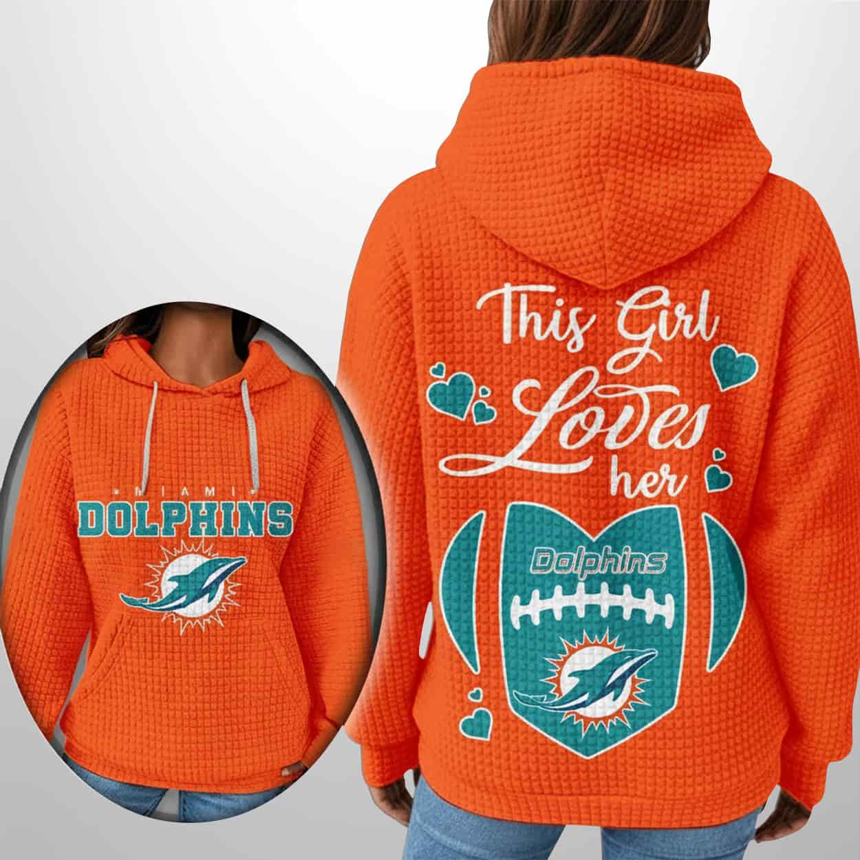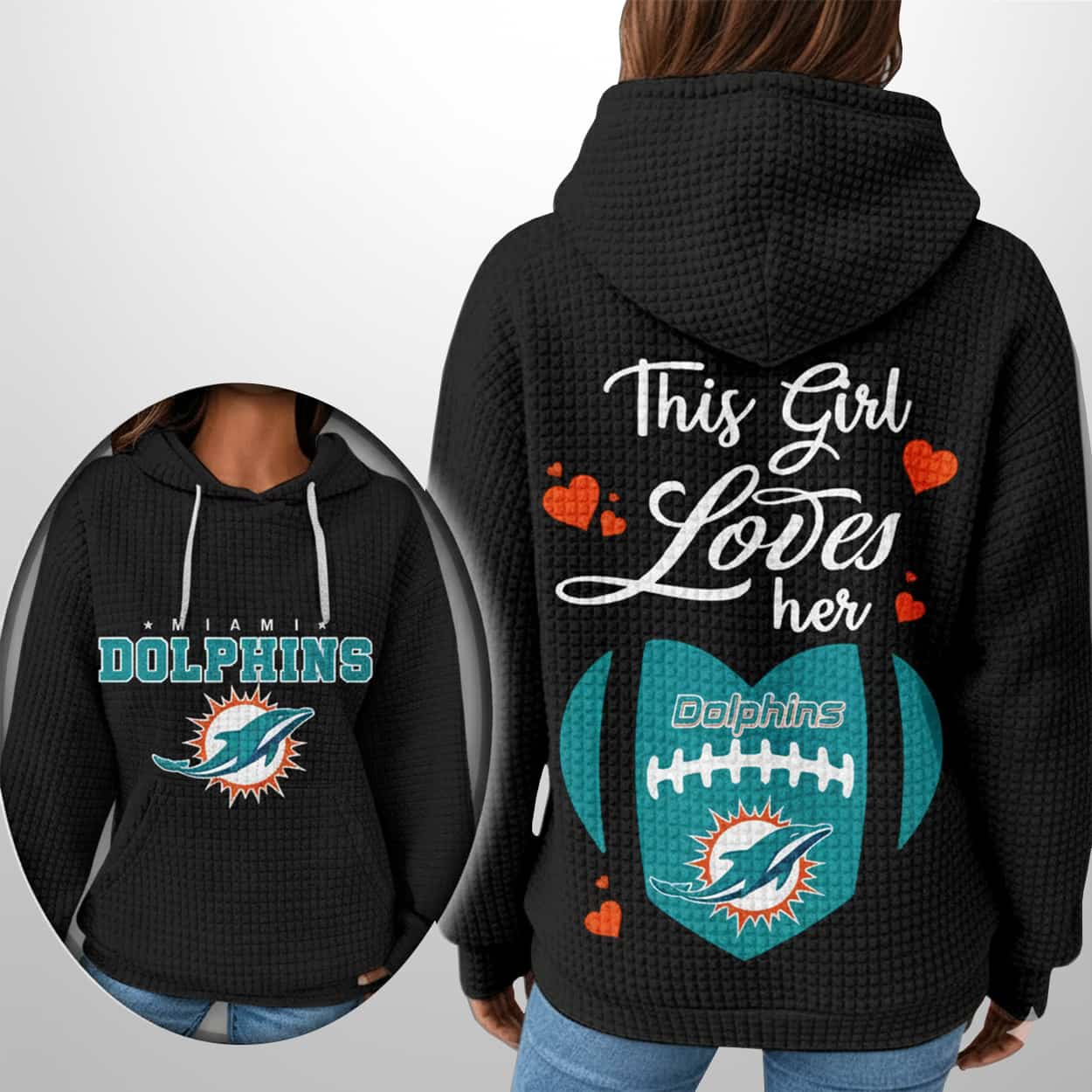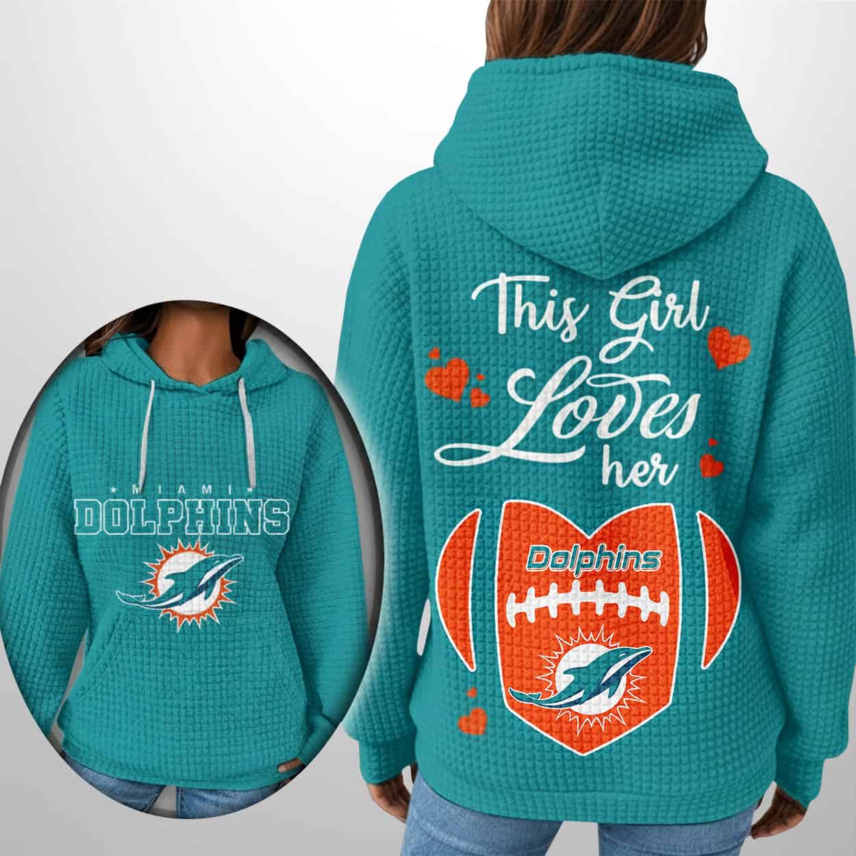 Show off your Dolphins devotion with the Dolphins This Girl Loves Hers Waffle Hoodie—where cozy meets team pride in teal.