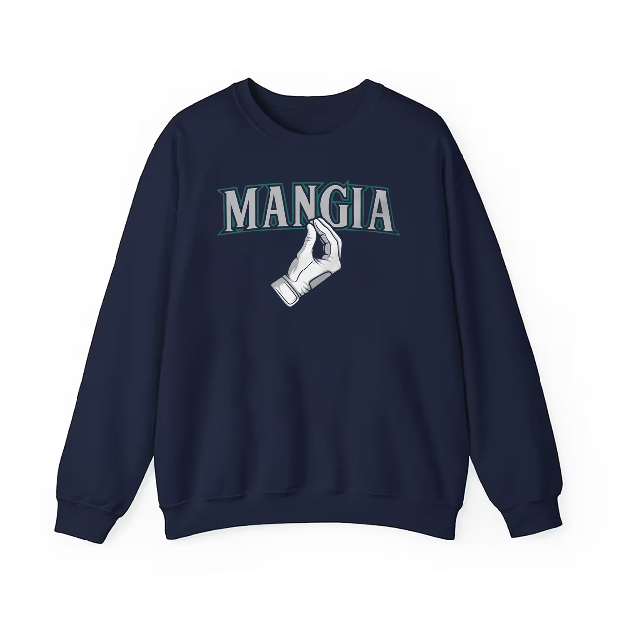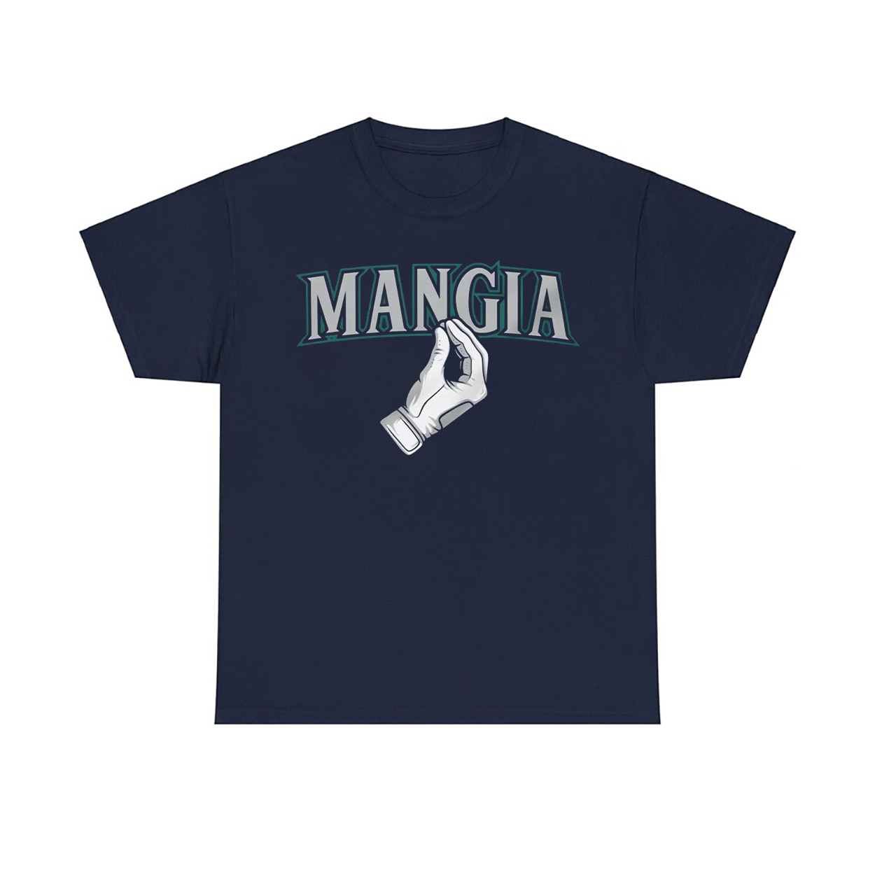 This shirt is more than just fan gear — it’s a cultural mashup that hits a home run in both fashion and fandom. Featuring the word MANGIA in bold, white-and-teal block letters, this navy blue tee grabs attention instantly. Just below the text, a hand flashes the iconic Italian “mangia” gesture — fingers pinched together, raised upward — a symbol that says, “Eat up!” with attitude. Whether you’re tailgating at T-Mobile Park or grabbing a slice in Pioneer Square, this shirt speaks your language: passion, pride, and a little playful sass.