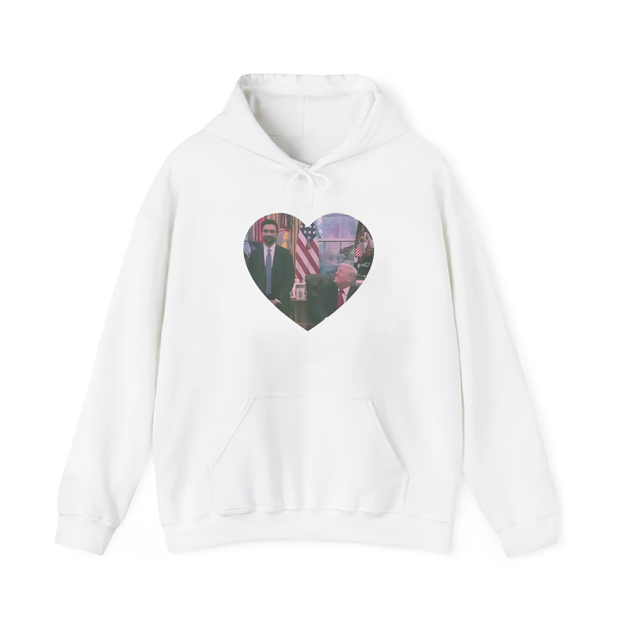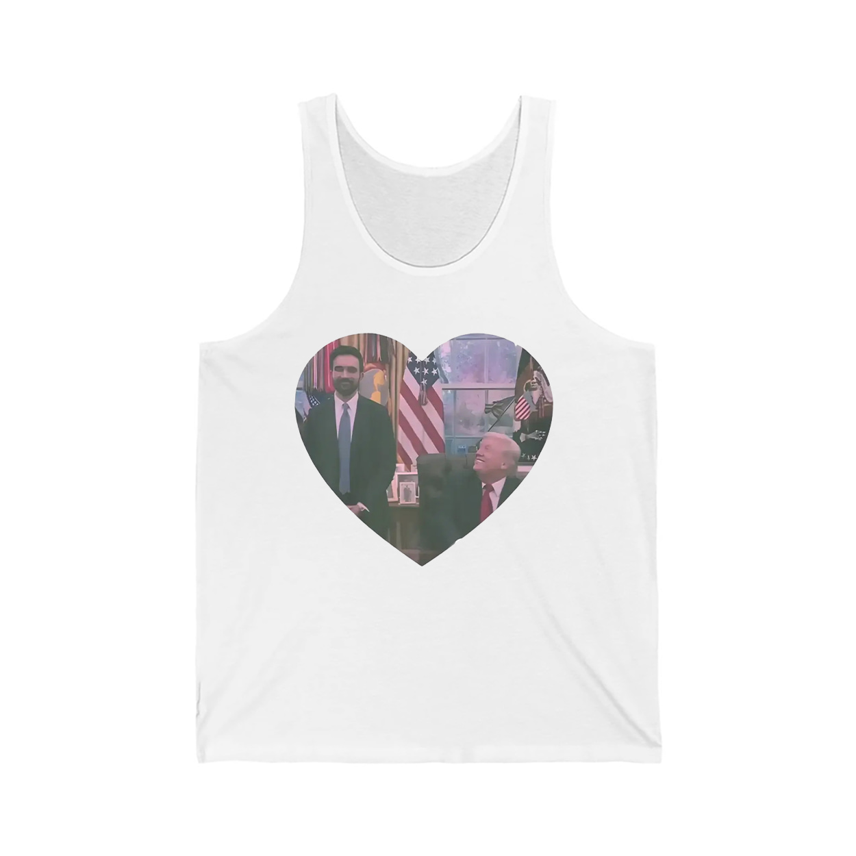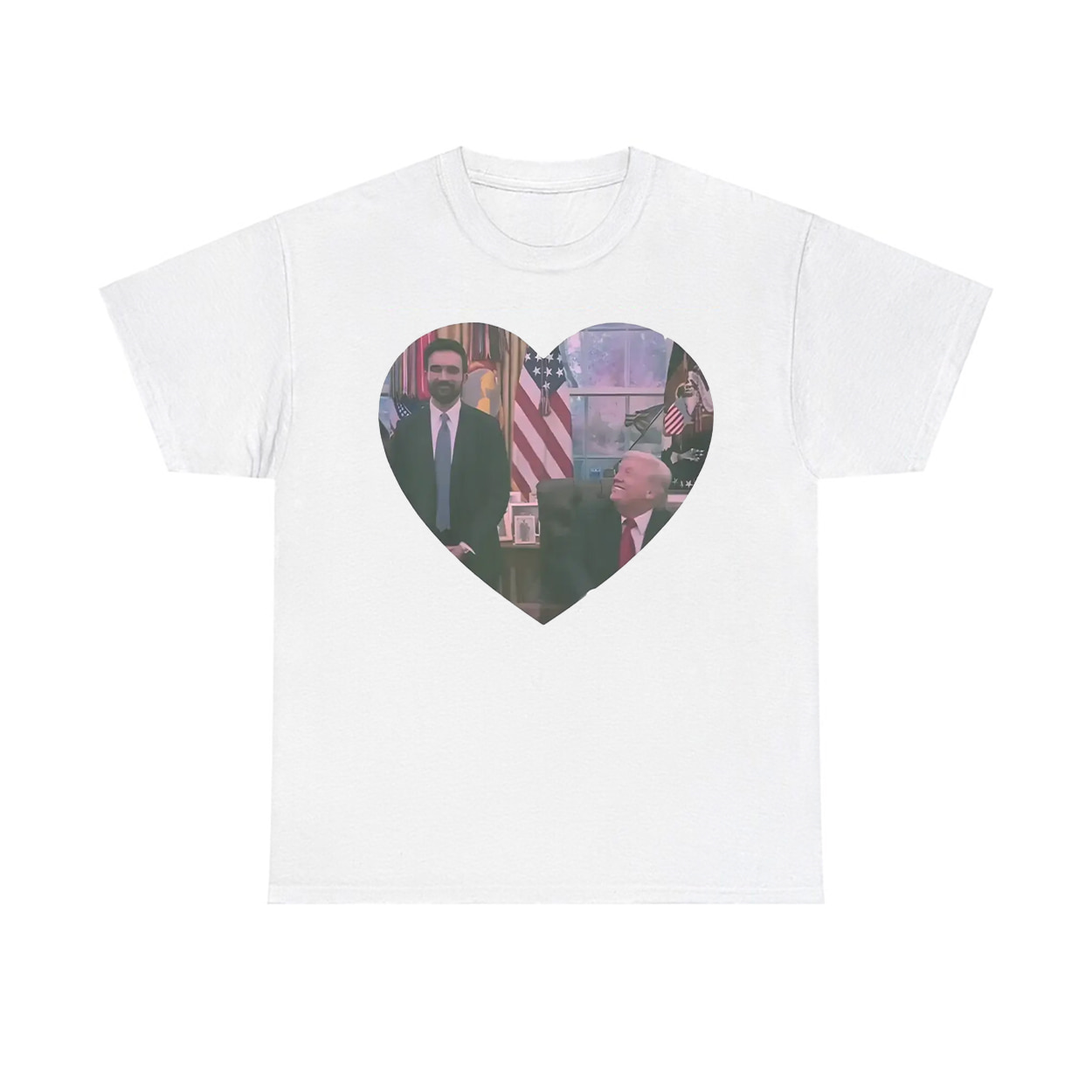 This shirt isn’t just clothing—it’s a conversation starter. Front and center is a heart-shaped graphic featuring Donald Trump and Zohran Mamdani in a formal setting, complete with an American flag backdrop and presidential ambiance. The image playfully suggests a moment of mutual respect or admiration, wrapped in the universal symbol of love. Whether you’re wearing it to a rally, a comedy night, this shirt guarantees double takes and spirited dialogue.