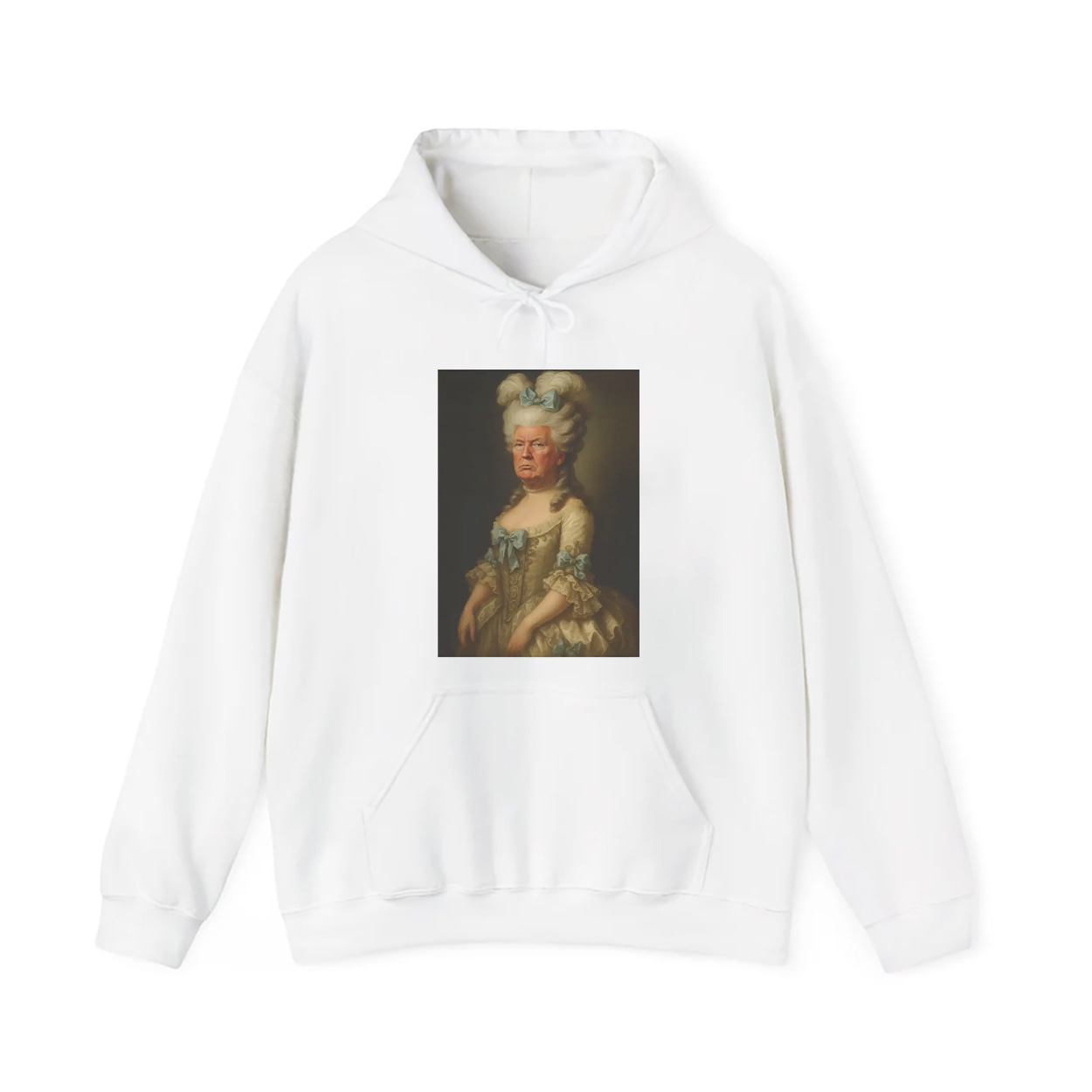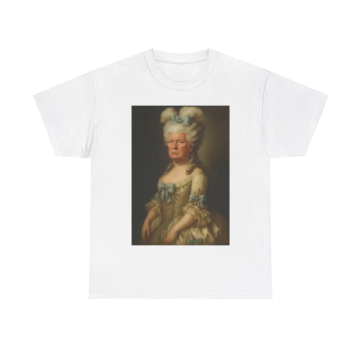 Step into the spotlight with a shirt that’s as audacious as it is unforgettable. This shirt features a striking classical-style portrait of Donald Trump reimagined as the infamous French queen herself. With a towering powdered wig, a lavish floral gown, and a regal pose that screams “extra,” this mashup turns history on its head. The dark, moody background adds drama, while the playful absurdity of the image makes it a walking conversation starter. Whether you’re headed to a protest, a party, or just brunch with friends, this tee lets you wear your wit on your sleeve.