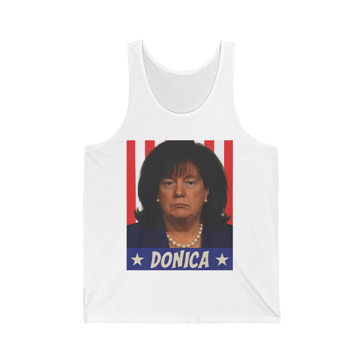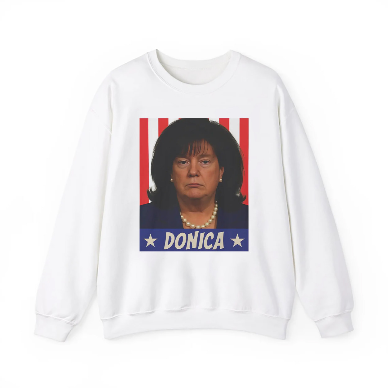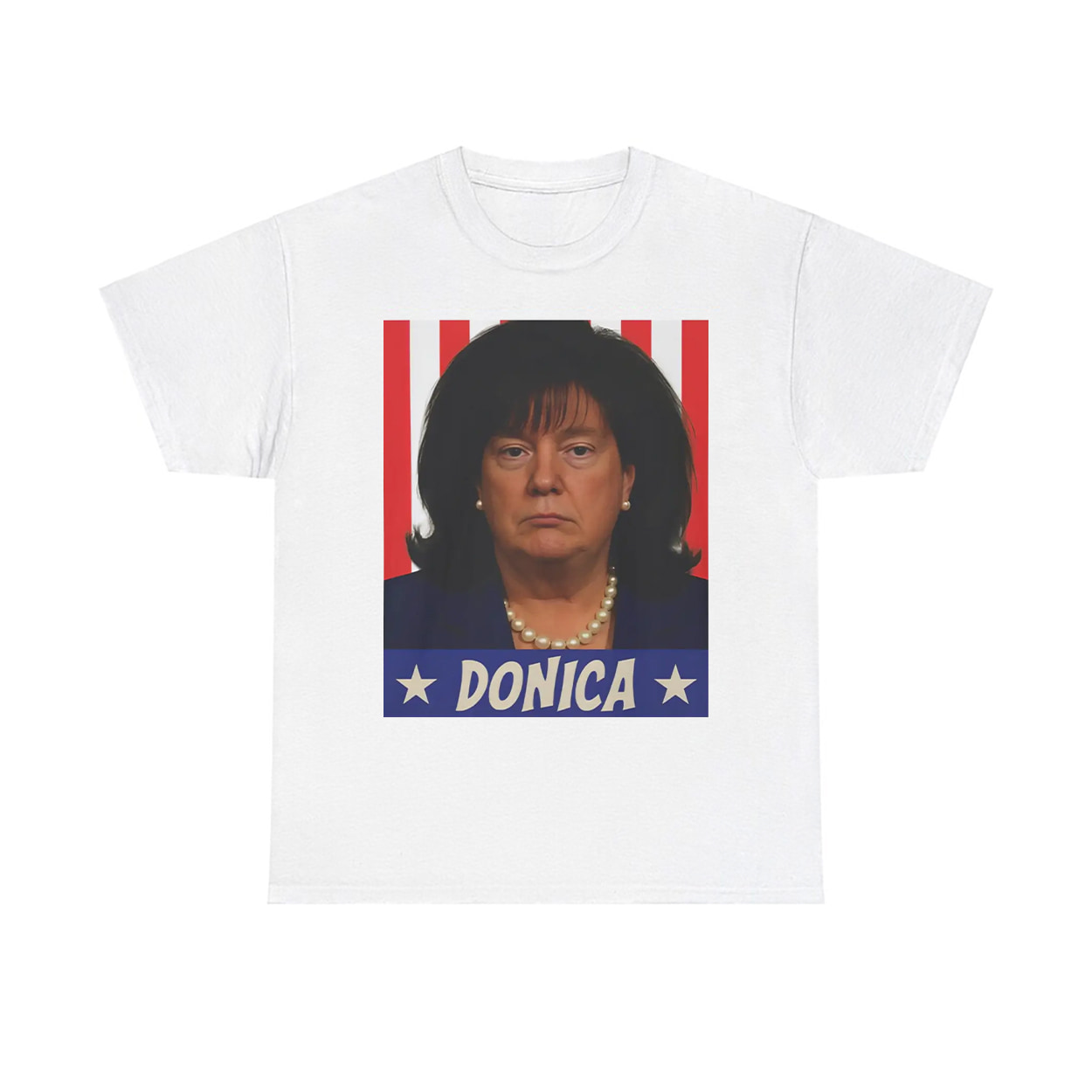 Looking for a bold and humorous shirt that gets people talking? This shirt delivers a punch of wit and irony with every wear. Featuring a stylized portrait of a serious-faced figure in a bob-cut wig, dramatic makeup, and a pearl necklace, the design is framed by red and white stripes reminiscent of the American flag. Beneath the image, a blue banner with white stars proudly displays the name “DONICA” in bold capital letters—evoking the aesthetic of a political campaign with a twist.