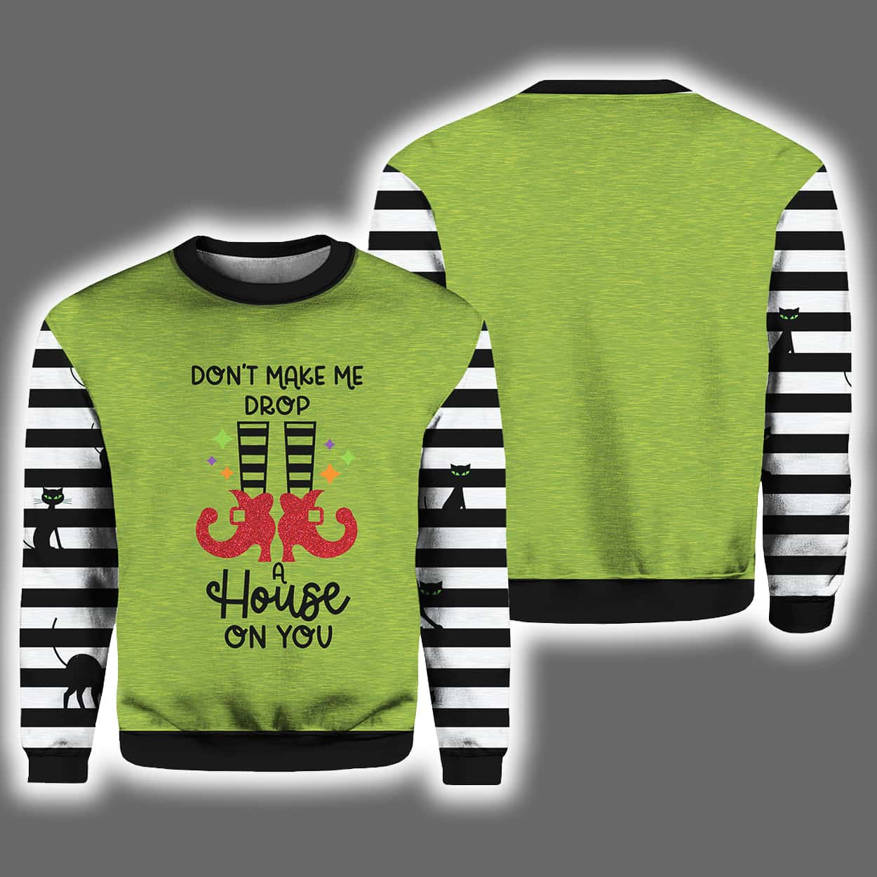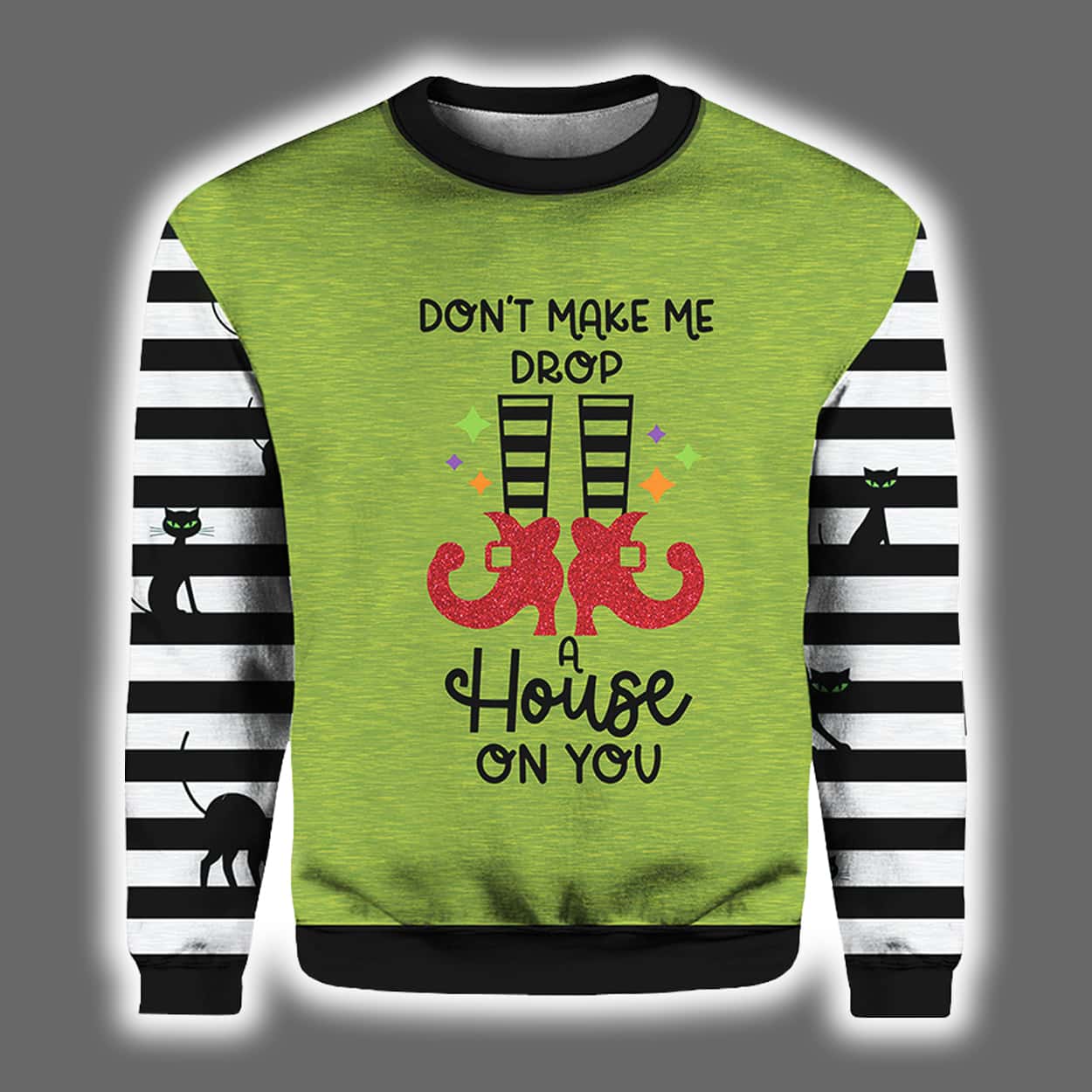 This isn’t just a Halloween shirt—it’s a whole mood. With a vibrant green body and black-and-white striped sleeves, this festive sweatshirt grabs attention from every angle. The front features a pair of cheeky red elf shoes with curled toes, perched beneath striped stockings that scream “witchy mischief.” Framing the image is the bold, hilarious warning: “DON’T MAKE ME DROP A HOUSE ON YOU.” It’s a playful nod to classic witch lore with a modern twist. Add in the black cat silhouettes dancing along the sleeves, and you’ve got a look that’s equal parts spooky and sassy.