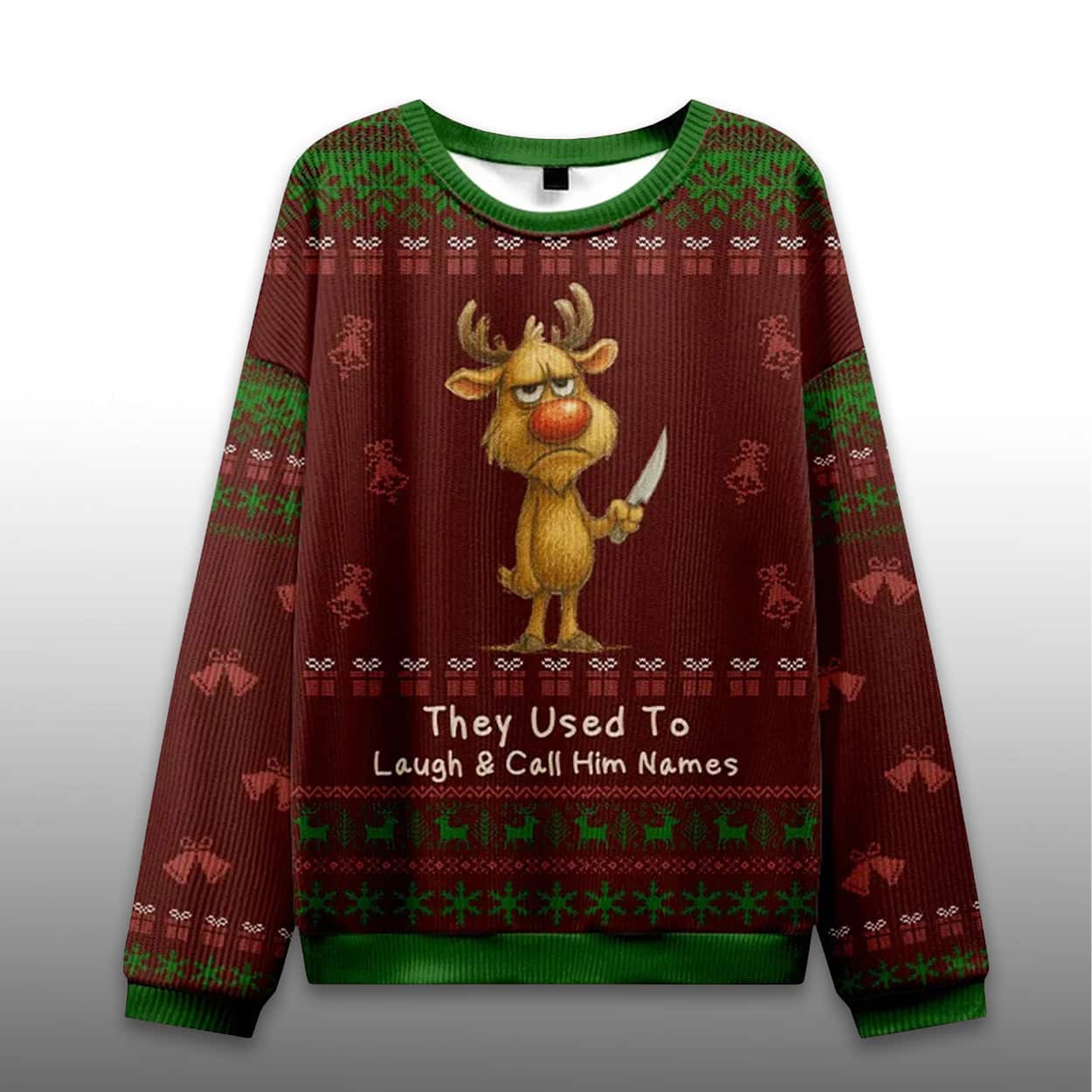 This pullover puts a hilarious and dark twist on a classic holiday story. It’s designed in a festive maroon and green “ugly Christmas sweater” style, complete with knit patterns of bells, reindeer, and snowflakes. The undeniable centerpiece is Rudolph the Red-Nosed Reindeer, looking fed up and holding a knife, all set above the famous, ominous line: “They Used To Laugh & Call Him Names.” The back of the sweater completes the holiday theme with a “Merry Christmas” greeting.