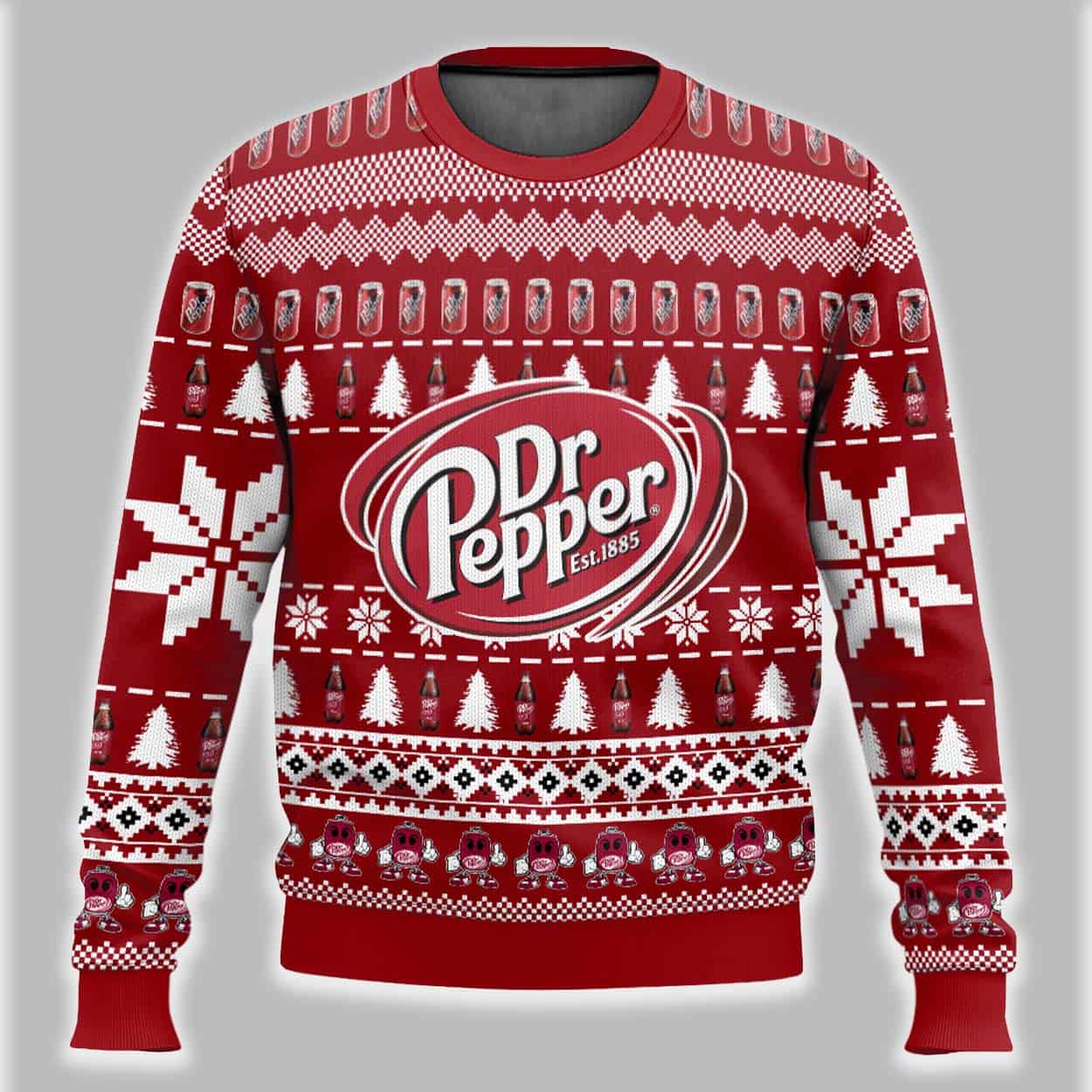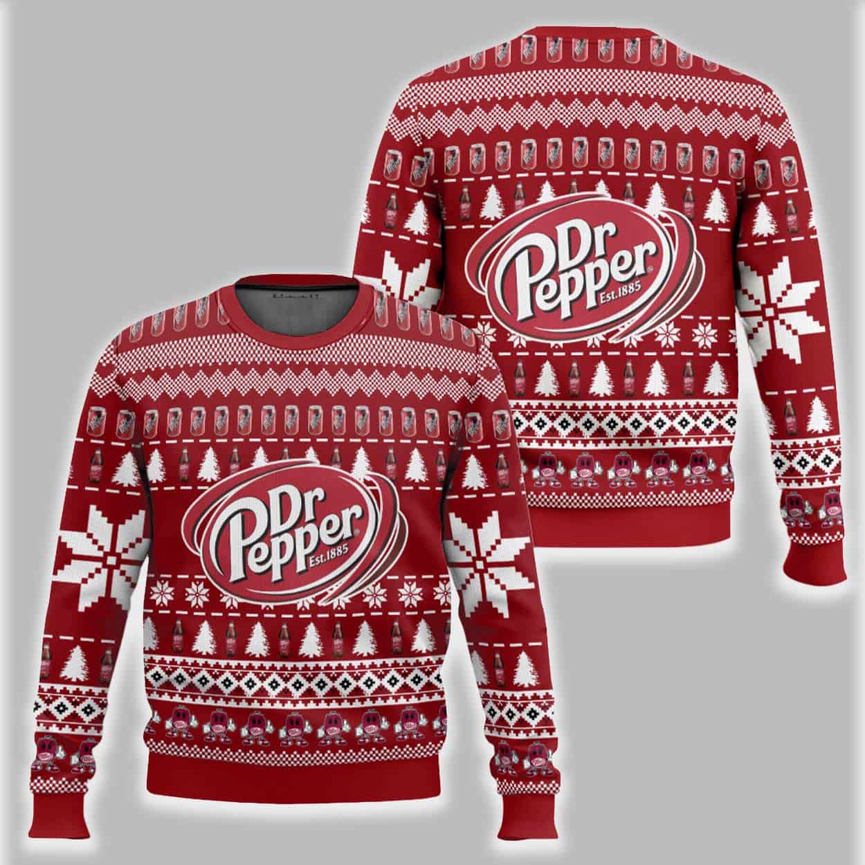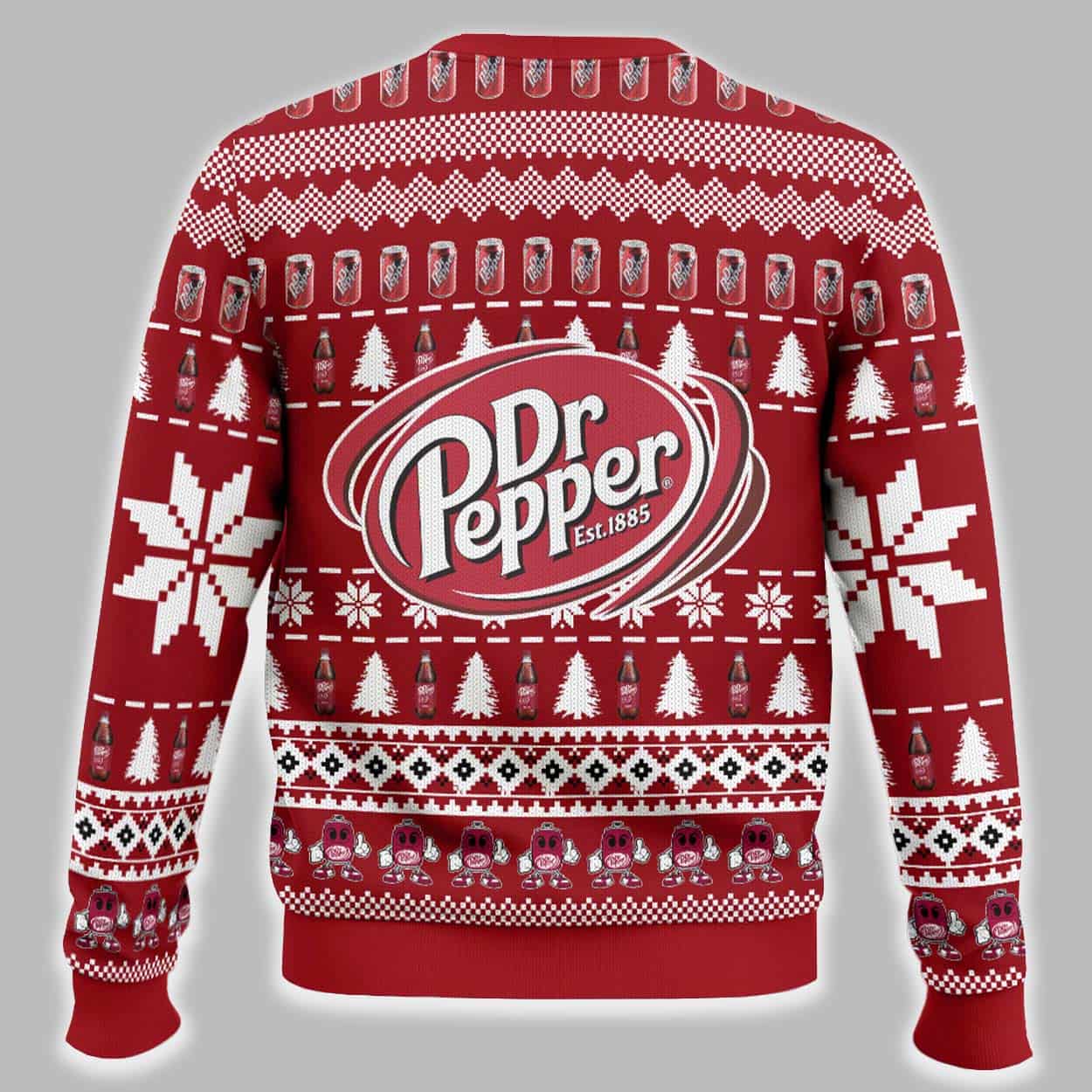 Quench your thirst for holiday cheer with this unique Dr Pepper Ugly Christmas Sweater. This vibrant red pullover is designed in the classic “knit-style,” covered in festive white patterns including snowflakes, Christmas trees, and geometric borders. The sweater proudly displays the iconic Dr Pepper oval logo with “Est. 1885” on both the front and back. Adding to the fun, the design includes repeating rows of tiny Dr Pepper cans and bottles, making it the ultimate tribute to your favorite soda.
