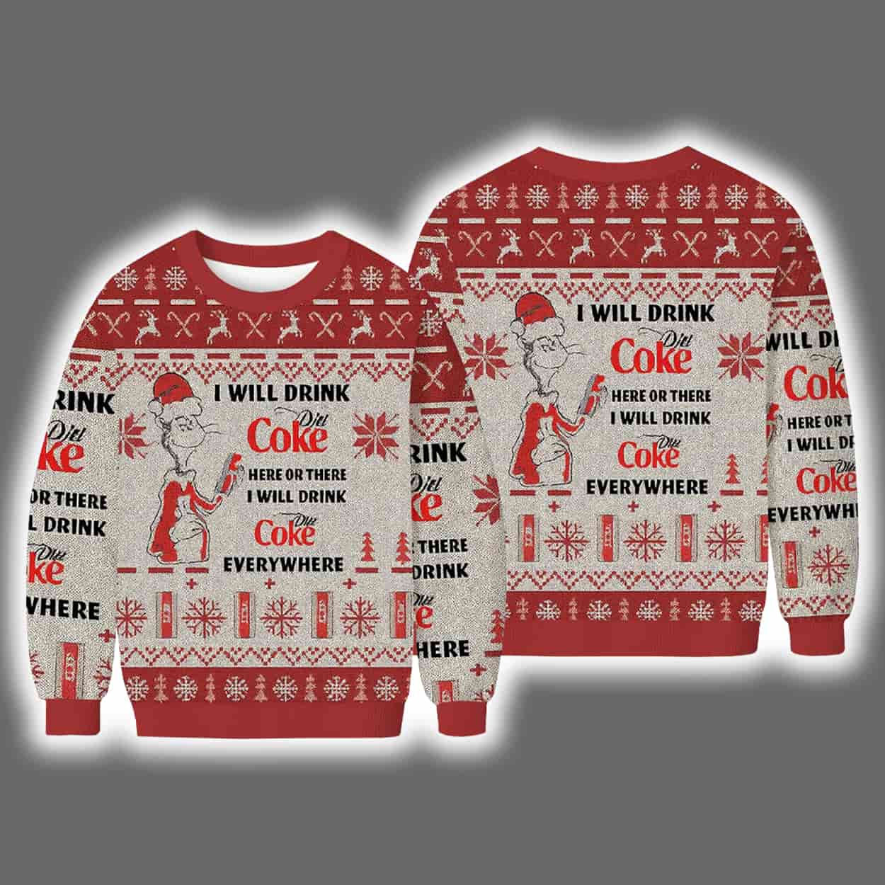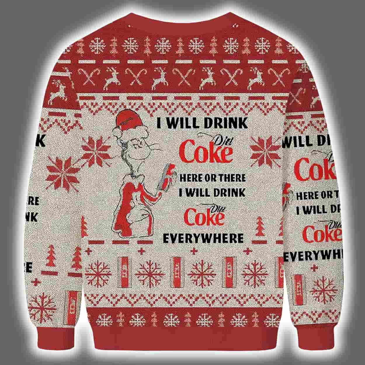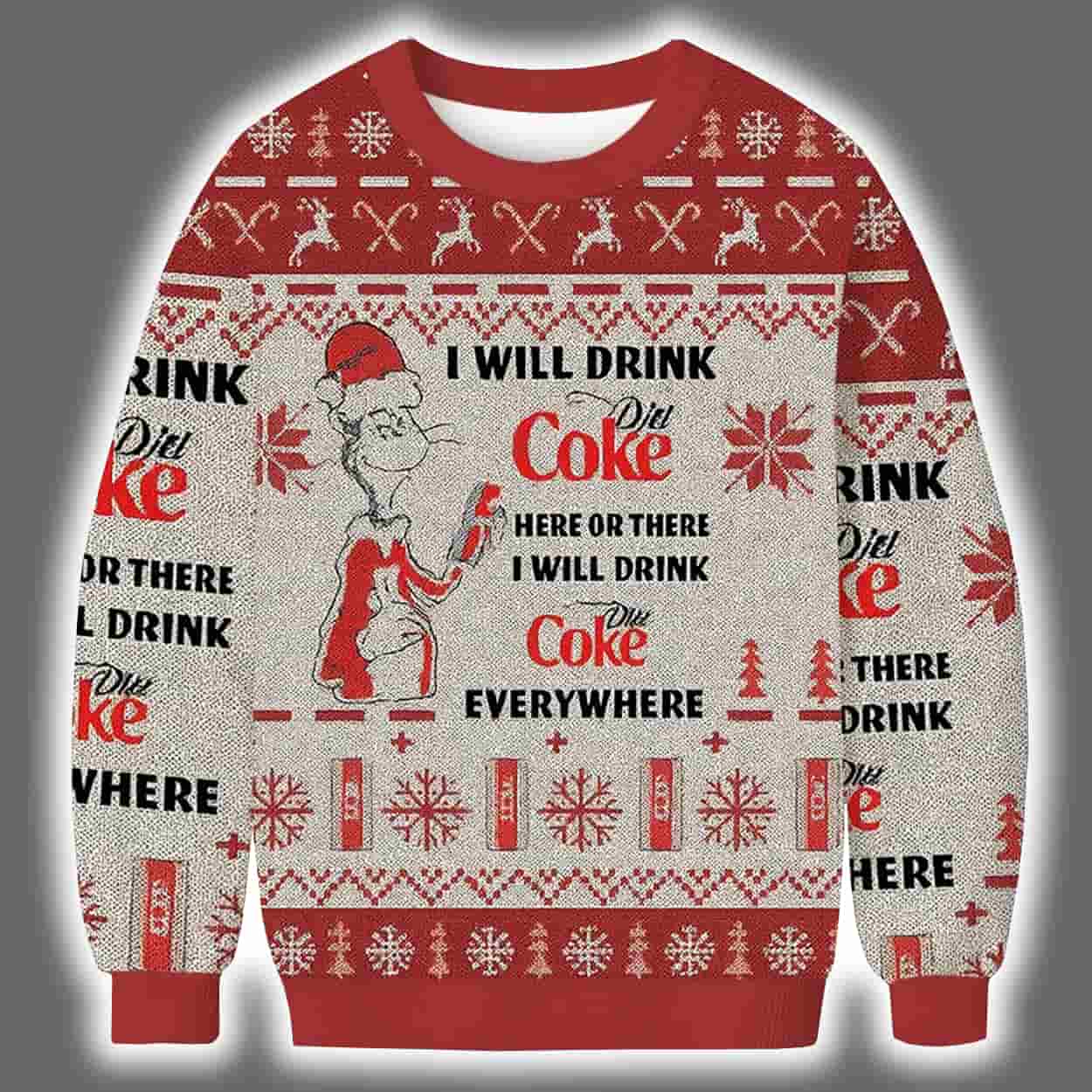 Celebrate the holidays with a fizzy twist in the Dr Seuss I Will Drink Diet Coke Ugly Christmas Sweater. A whimsical blend of festive cheer and soda fandom, perfect for bold personalities and Coca-Cola lovers.