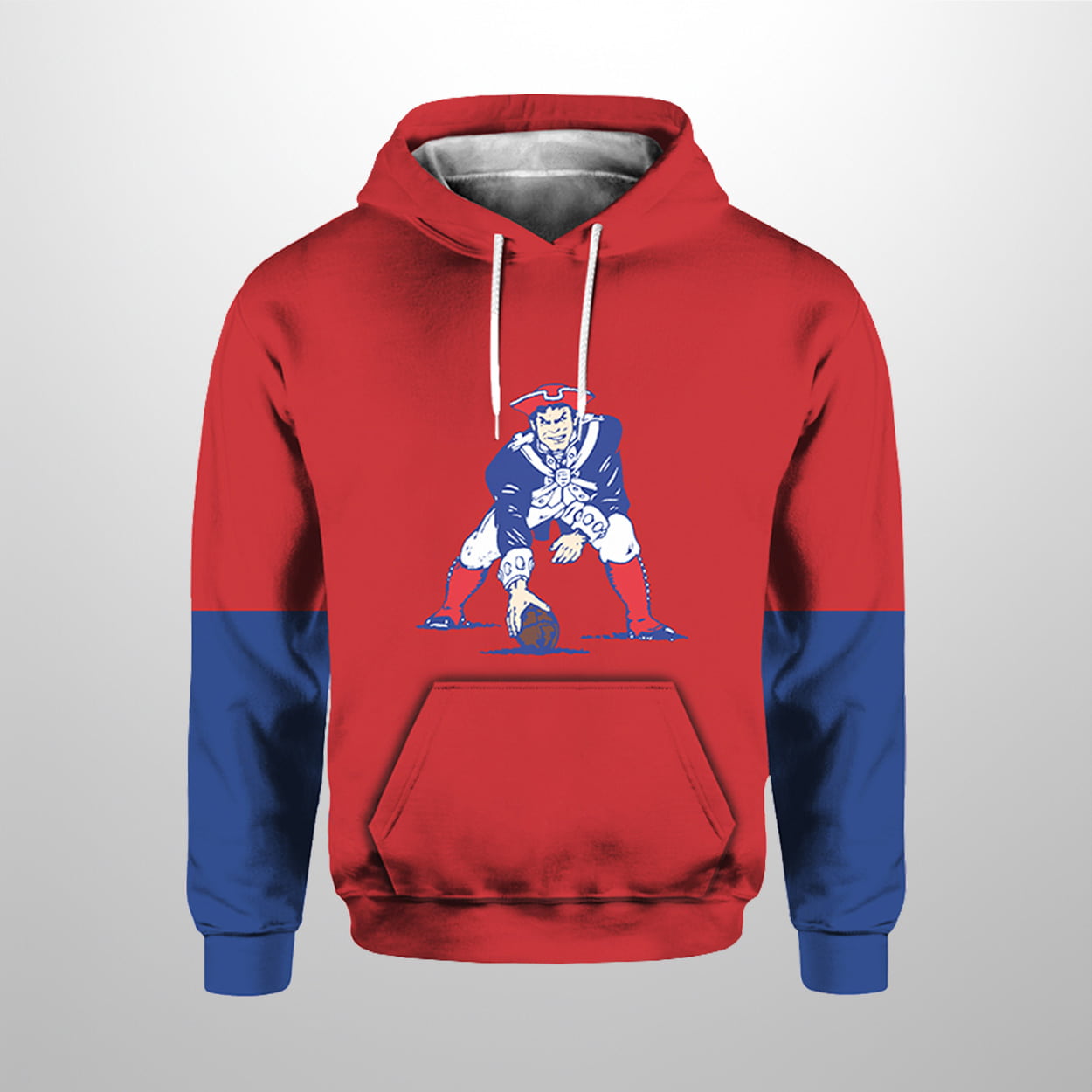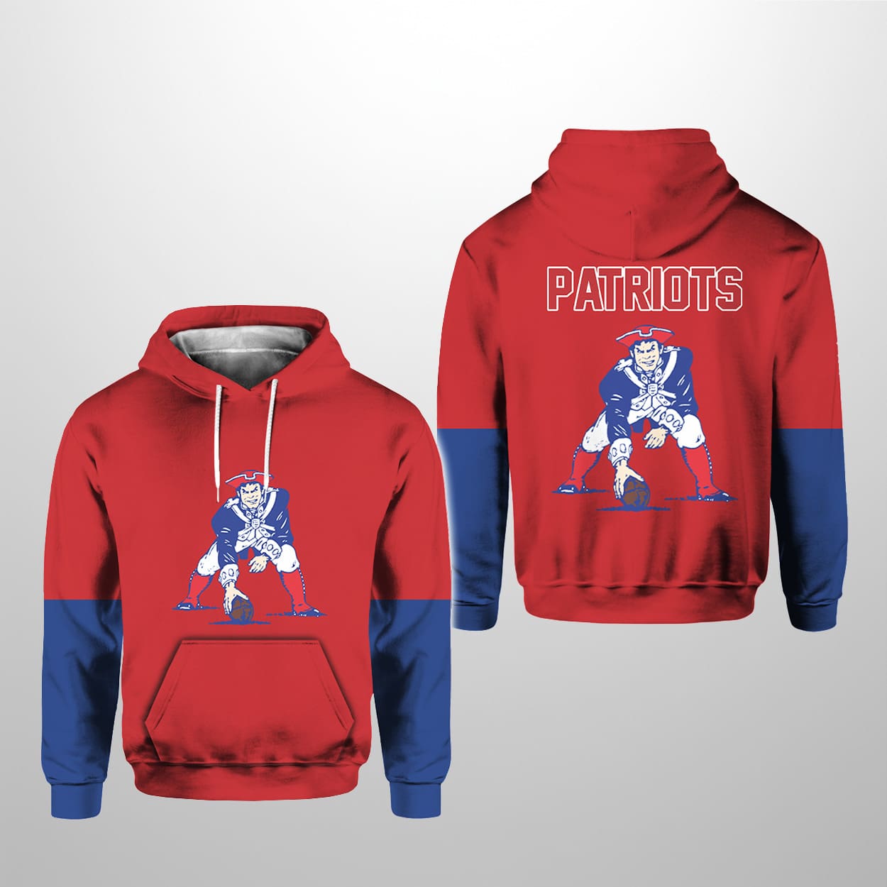This hoodie is a blast from the past with a fresh twist. Drenched in bold red and blue, it features the iconic “Patriots” logo—our Revolutionary War hero in a football stance—front and center. The back doubles down with the same vintage emblem, crowned by the word “PATRIOTS” in crisp white block letters. Red sleeves with blue cuffs and a white drawstring add a punch of contrast, making this hoodie a standout piece whether you’re tailgating or just turning heads on the street.