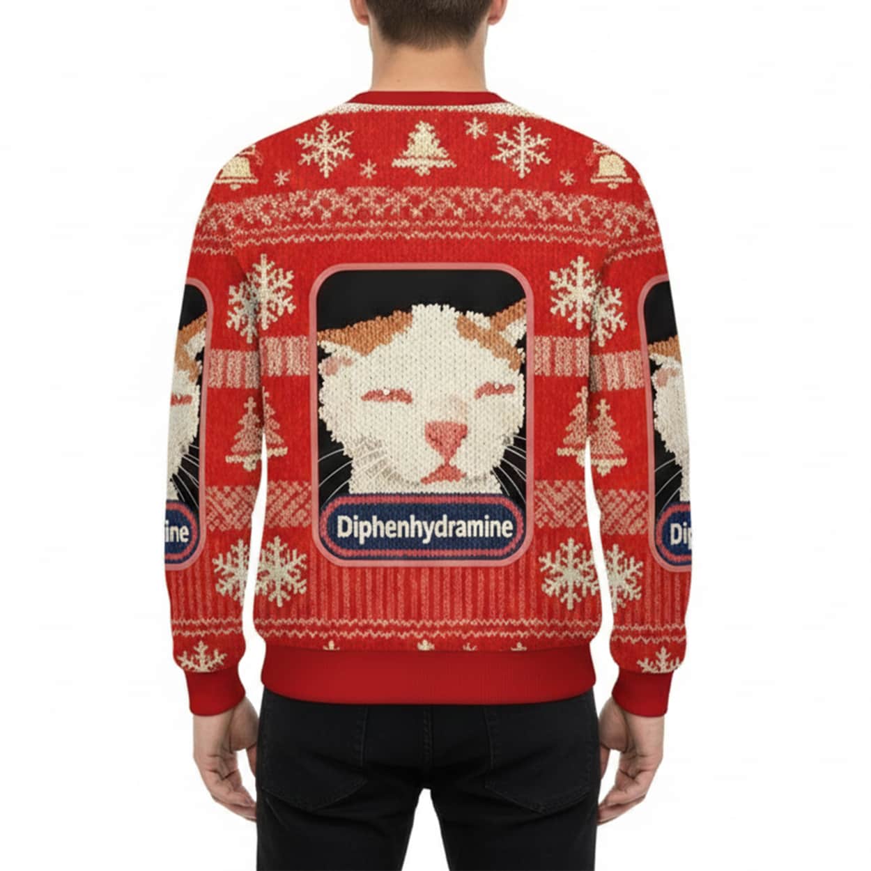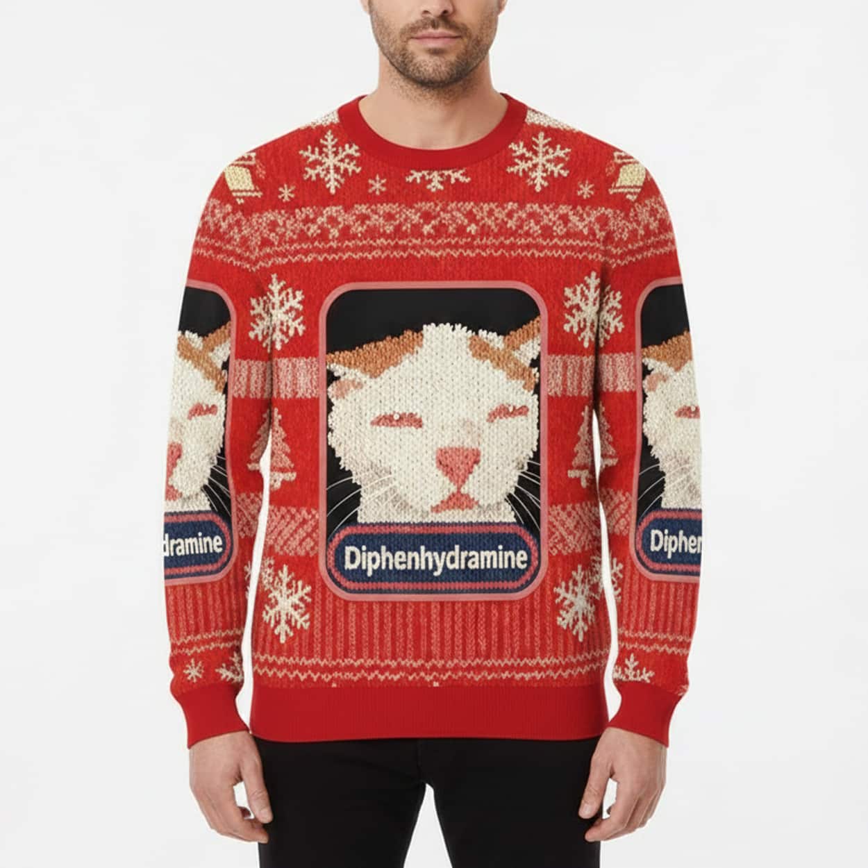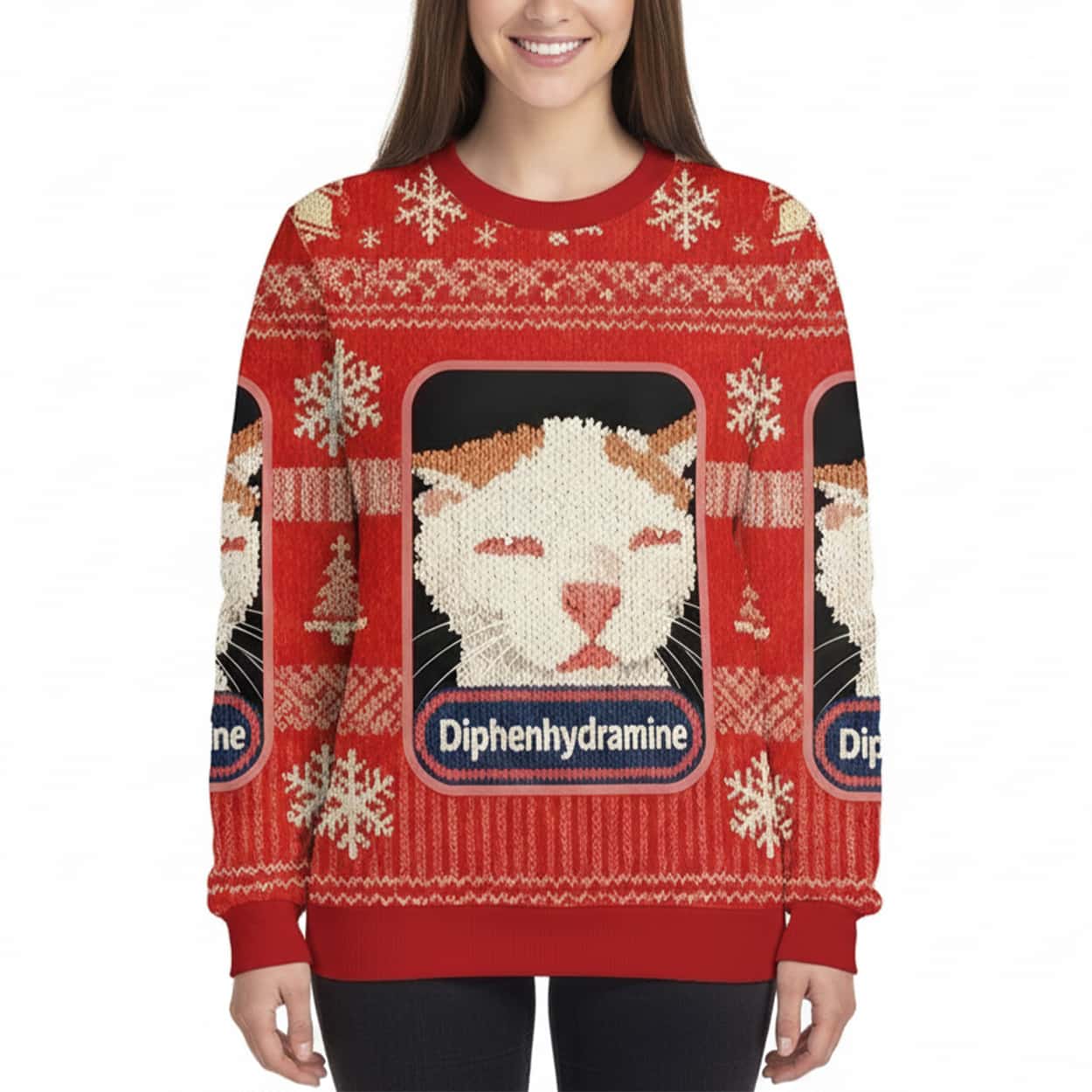 Say hello to the purr-fect blend of holiday spirit and meme-worthy mischief. This sweater features a repeating pattern of a hilariously unimpressed feline, framed like a prescription label. Beneath each sleepy cat face is the word “Diphenhydramine”—a nod to the antihistamine known for its snooze-inducing powers. Snowflakes and classic knit motifs add a festive touch, making this sweater a standout at any holiday gathering. Whether you’re lounging by the fire or nodding off during a family movie marathon, this design lets everyone know you’re embracing the season at your own pace.