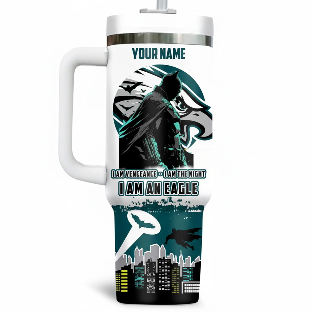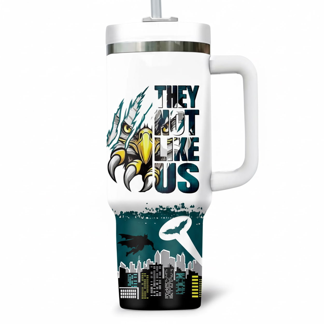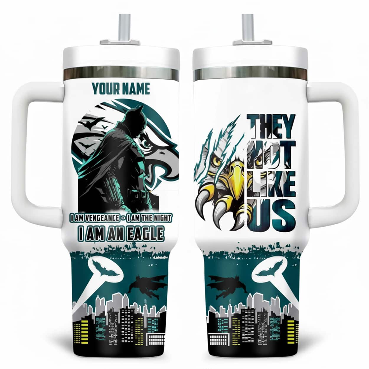 Crafted in sleek white with a sturdy handle and straw, this tumbler features two electrifying designs. One side showcases a brooding Batman silhouette backed by the Philadelphia Eagles logo, declaring: “I AM VENGEANCE • I AM THE NIGHT • I AM AN EAGLE.” The other side? A ferocious eagle clawing through the phrase “THEY NOT LIKE US”—a rallying cry that’s part sports chant, part existential truth. Below both, a gritty cityscape anchors the design, reminding you that justice—and victory—starts in Philly.