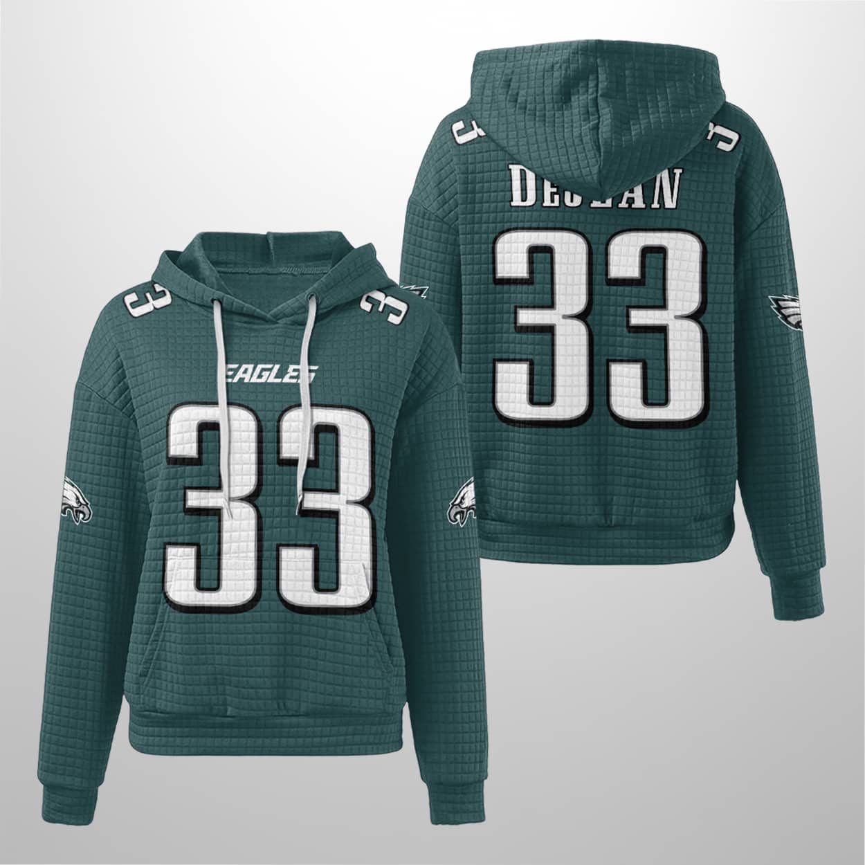 This hoodie isn’t just a nod to the Eagles—it’s a full-on touchdown celebration. Cloaked in rich green with a textured waffle finish, this hoodie brings the stadium vibes to your everyday style. The front features “EAGLES” in bold white lettering above the powerful number “33,” outlined in black for extra pop. Flip it around and you’ll find “DeJean” printed above the same number, making it clear who you’re repping. With eagle logos on both sleeves, white-striped arms, and a drawstring hood, this hoodie is built for fans who like their fashion fierce and their loyalty loud.