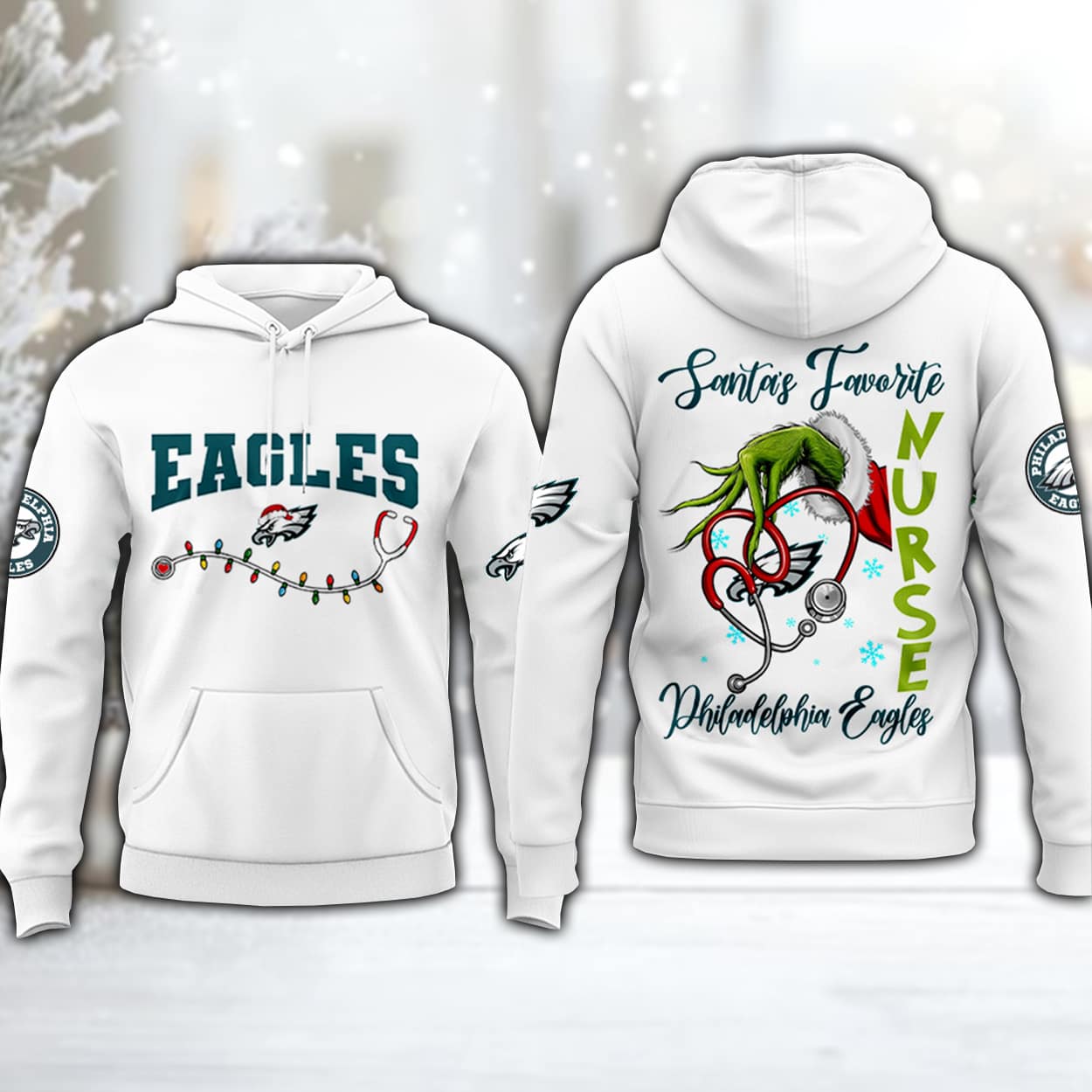 This hoodie is a touchdown for anyone who lives for football season and holiday sparkle. On the front, “EAGLES” stands proud in bold green lettering above the iconic team logo, while a stethoscope wrapped in twinkling Christmas lights adds a playful nod to healthcare heroes. Flip it around and you’ll find a whimsical design that reads “Santa’s Favorite Nurse,” with “NURSE” spelled vertically in vibrant green. A heart-shaped stethoscope, topped with a mischievous Grinch-style Santa hat and sprigs of holly, brings the whole look together with festive flair.