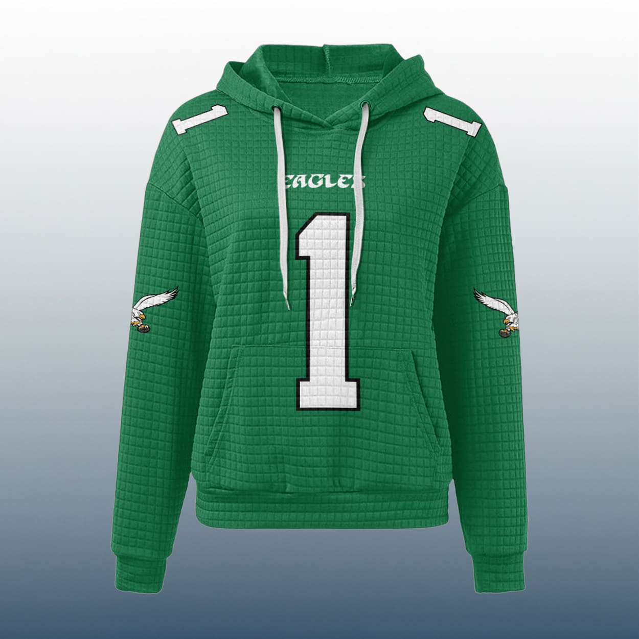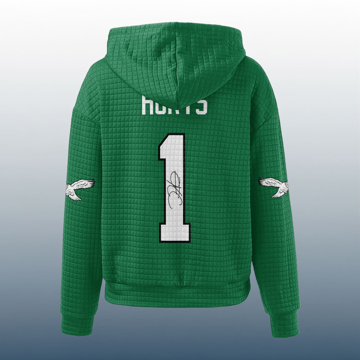 Turn heads and rally the flock with this hoodie. Drenched in deep green and textured with a quilted finish, this hoodie brings the heat on and off the field. The front proudly showcases “EAGLES” in bold white lettering across the chest, perched above a striking number “1.” Flip it around and you’ll find the same powerful digit on the back—this time featuring a signature detail that adds a personal touch from the quarterback himself. Eagle emblems on the sleeves and crisp white drawstrings complete the look, making this hoodie a true standout.