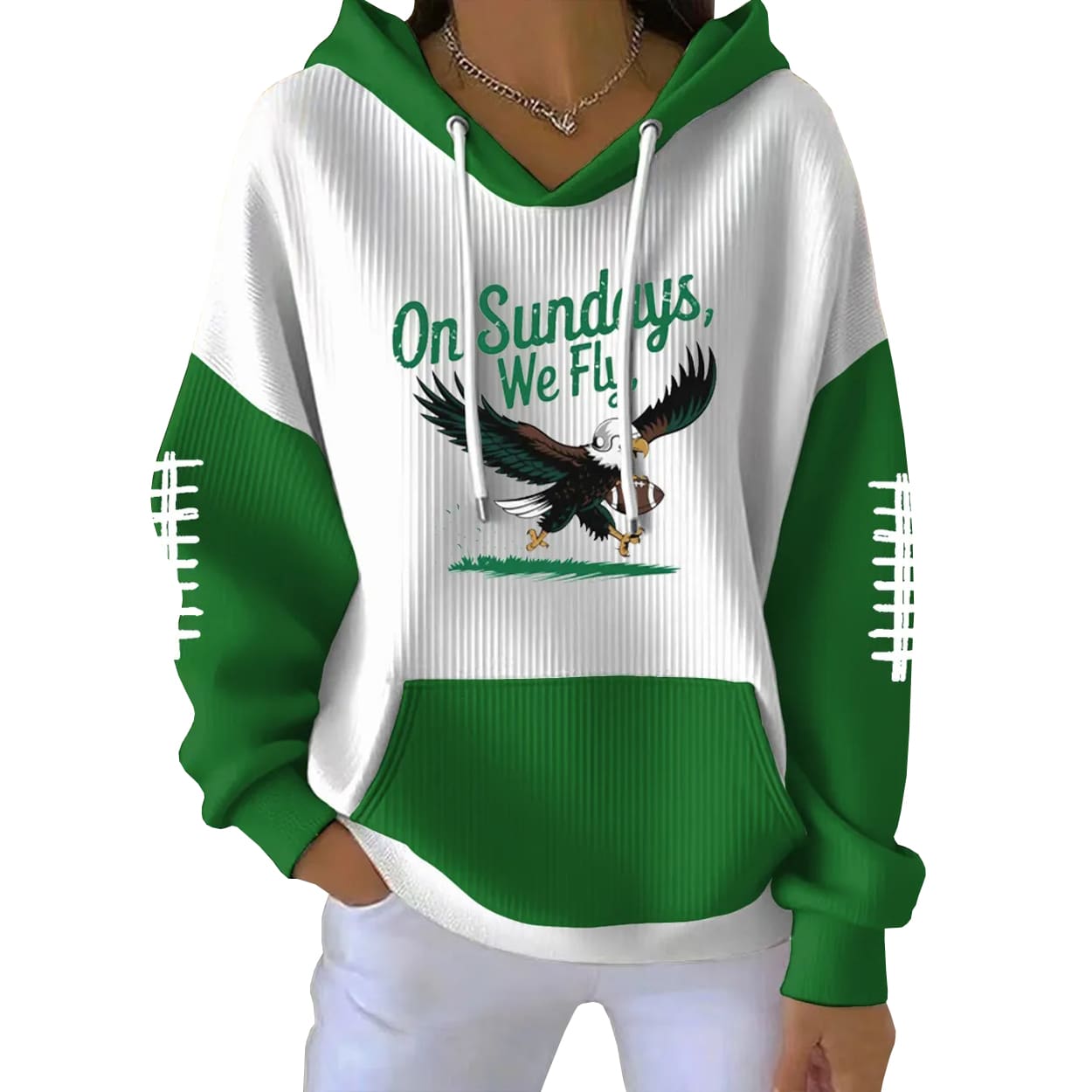 Get ready to take flight with this hoodie—a bold blend of team pride and street-ready swagger. This hoodie features a crisp white base with deep green sleeves and lower paneling, creating a sleek contrast that pops. Across the chest, a majestic eagle spreads its wings mid-flight, soaring beneath the rallying cry: “On Sundays, We Fly.” The sleeves are accented with white horizontal stitch-like graphics, adding a sporty edge that nods to the gridiron.