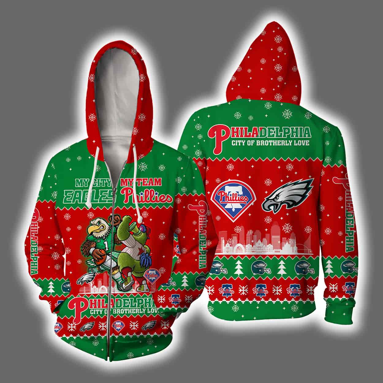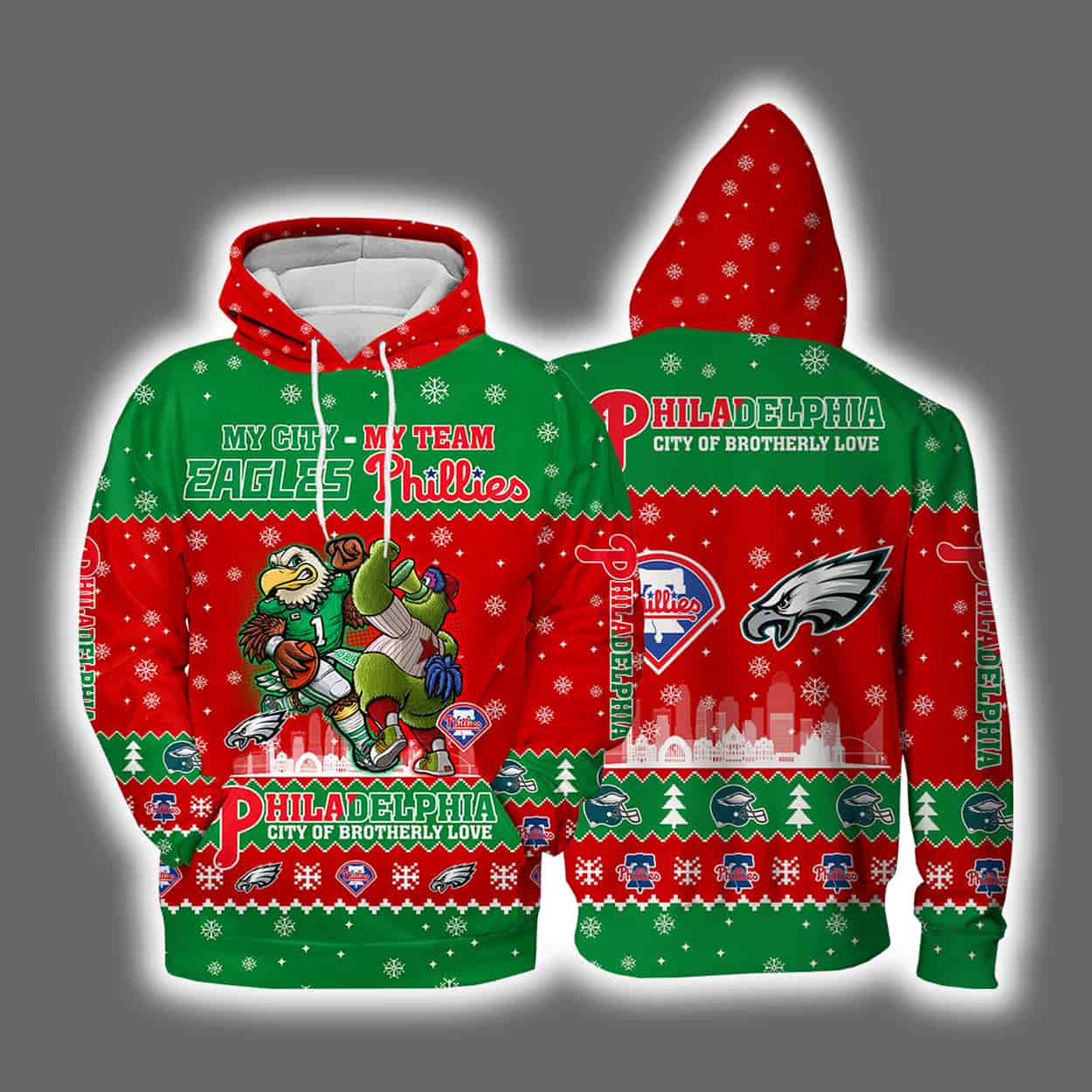 Get ready to turn heads at every holiday party with this hoodie—a vibrant mashup of festive cheer and die-hard sports devotion. Drenched in classic red and green with playful snowflake patterns, this hoodie channels the charm of an ugly Christmas sweater with a bold twist. On the front, two cartoon mascots—one repping the Eagles, the other the Phillies—under the phrase “MY SLEIGH MY TEAM EAGLES PHILLIES.” Below, the proud declaration “PHILADELPHIA CITY OF BROTHERLY LOVE” seals the deal. Flip it around and you’ll find team logos, a cityscape backdrop, and another shoutout to Philly’s iconic nickname.