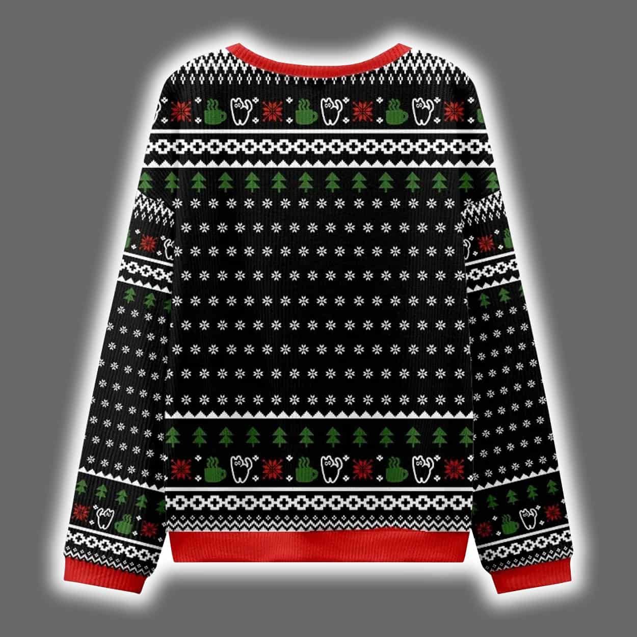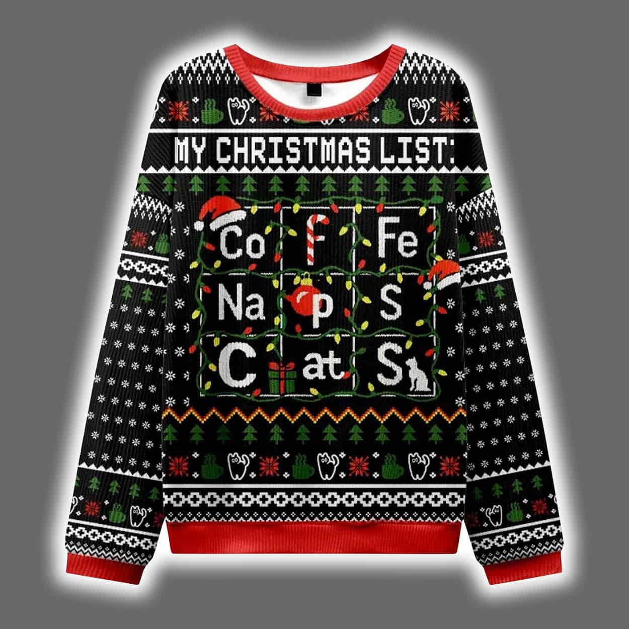 Turn heads and spark laughs this season with this sweater—a cheeky blend of holiday cheer and nerdy charm. This sweater pops with red accents and a flurry of snowflakes, Christmas trees, and Santa hats. Front and center, it features a faux periodic table labeled “MY CHRISTMAS LIST,” with boxes spelling out “Co,” “Ffe,” “Nap,” “S,” and “Cat”—each whimsically topped with Santa hats. Whether you’re sipping coffee, snoozing through the season, or snuggling your feline friend, this sweater speaks your holiday truth in bold, blocky brilliance.