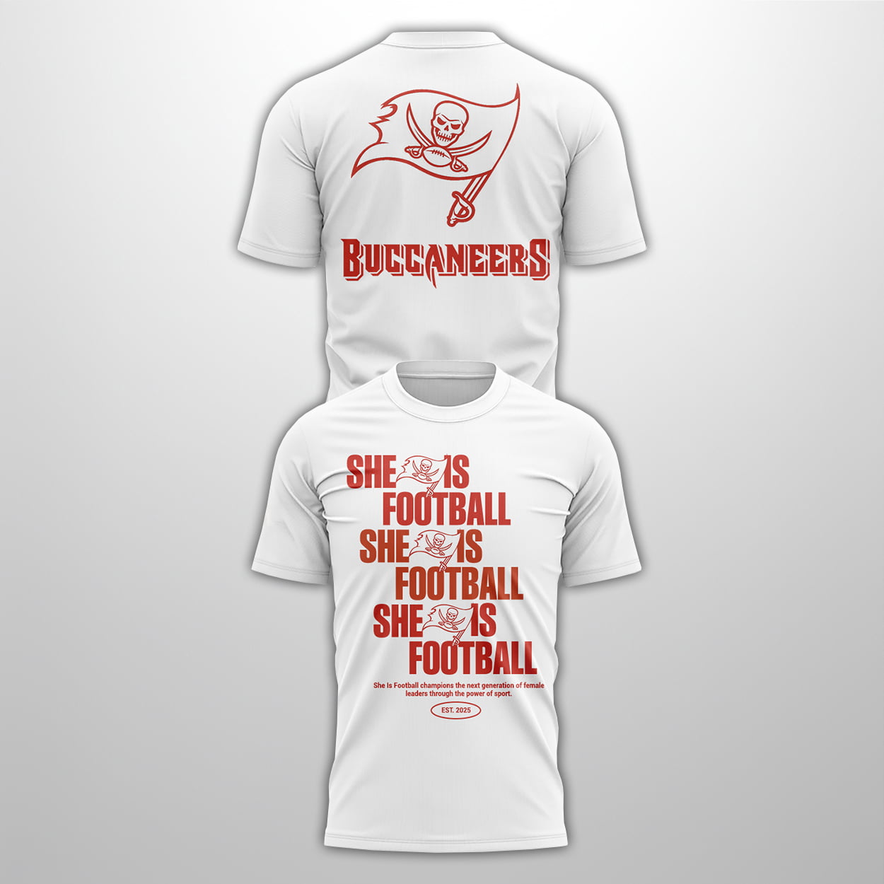 Step into the spotlight with this shirt—a dynamic fusion of sport, style, and statement. On the front, the phrase “SHE IS FOOTBALL” bursts across the chest in triple formation, each line flanked by the fierce Buccaneers logo. It’s not just repetition—it’s a rallying cry. Beneath it, a powerful message reads: “She is Football champions the next generation of female leaders through the power of sport.” Flip it around and you’ll find the iconic Buccaneers flag and bold “BUCCANEERS” lettering that screams team pride.