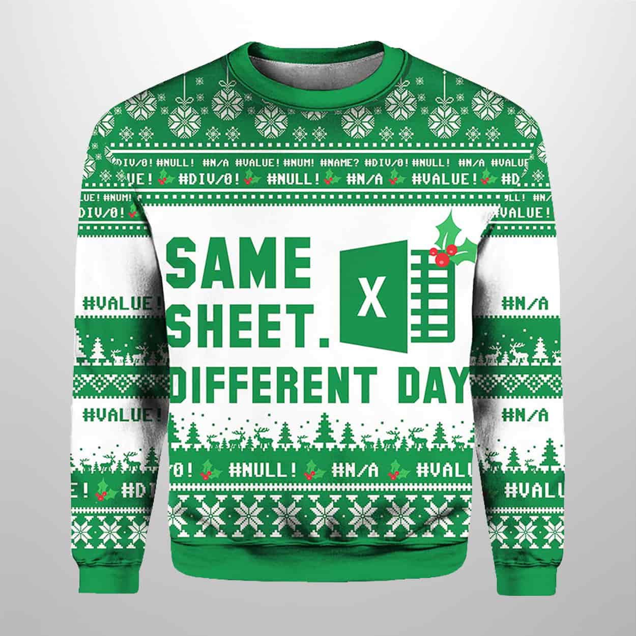 This hilariously relatable ugly Christmas sweater is a must-have for anyone who spends their days knee-deep in cells and formulas. Dominated by a festive green and white color scheme, the design cleverly merges holiday cheer with the daily grind. The main graphic features the iconic Microsoft Excel logo, decked out with a sprig of holly. Surrounding the bold central text, “SAME SHEET. DIFFERENT DAY.”, are scattered, yet recognizable, spreadsheet error codes like #N/A, #NULL!, and #VALUE!