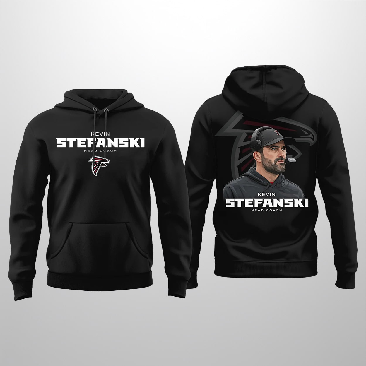 Make way for the most unexpected twist in football fashion. From the front, it’s all business—“KEVIN STEFANSKI” printed above the unmistakable Falcons logo. But flip it around and the real fun begins: a bold graphic of Stefanski himself, cap on, Falcons logo blazing behind him, and the title “HEAD COACH” stamped below. It’s a head-scratcher, sure—but also a head-turner. Whether you’re a die-hard fan, a meme enthusiast, or just love a good sports mix-up, this hoodie delivers.