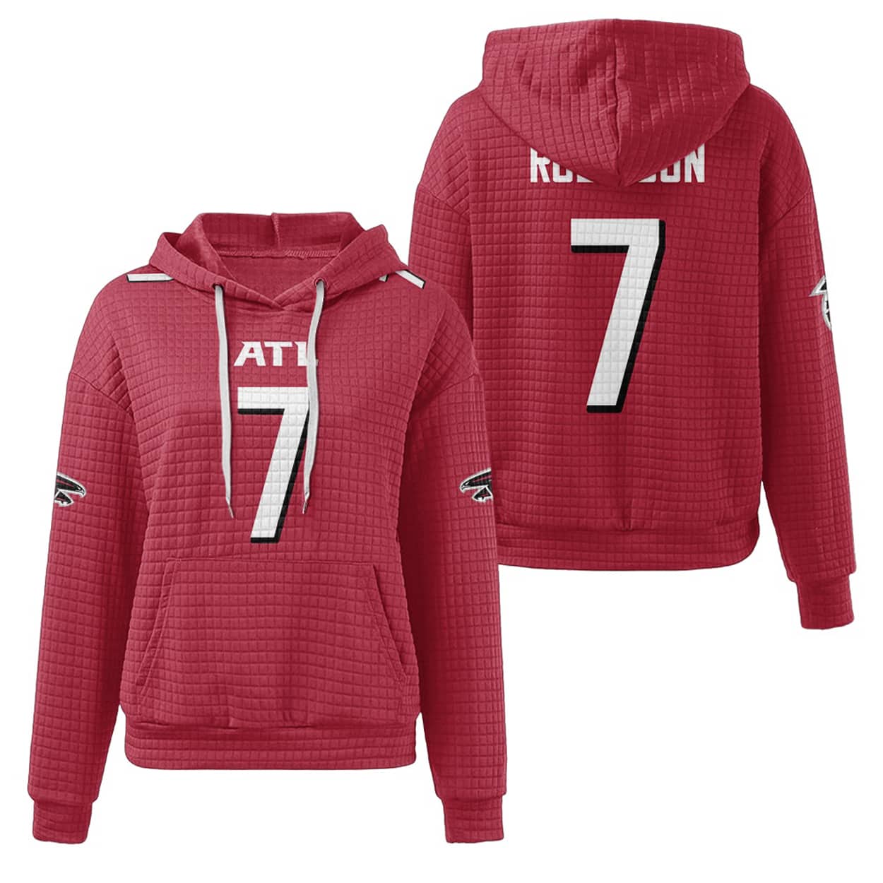 Step into the spotlight with this hoodie — a fan favorite that blends streetwear edge with gridiron glory. This hoodie pops with red “ATL” lettering across the chest, sitting confidently above the number 7, while the back proudly displays “ROBINSON” and that same iconic number. The sleeves feature the fierce Falcons logo, and the textured waffle pattern adds depth and dimension to your game-day fit. White drawstrings and a roomy front pocket round out the look, making it as functional as it is fly.