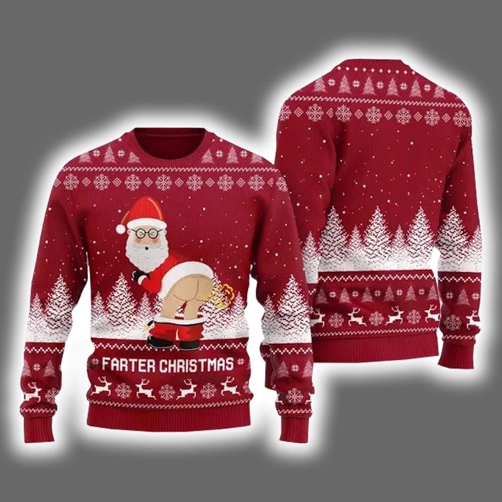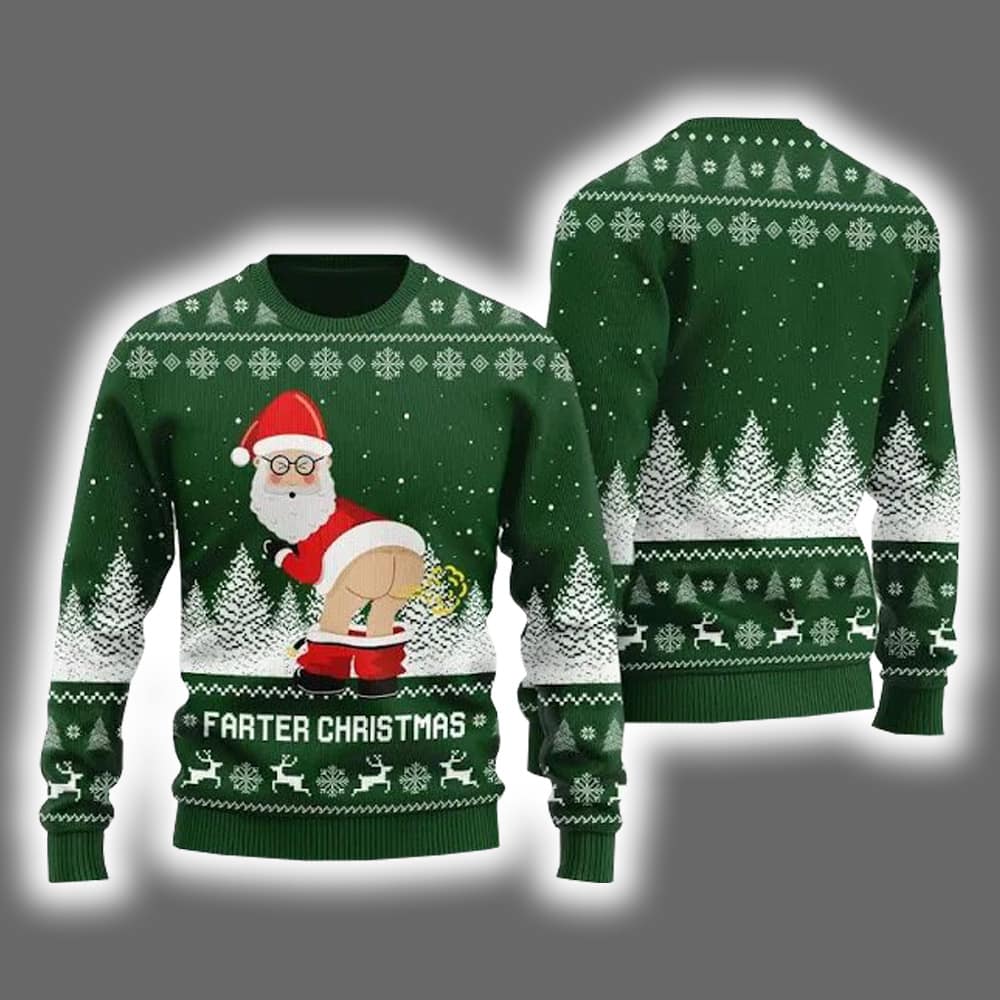 Deck the halls with laughter in the Farter Christmas Funny Santa Ugly Holiday Sweater. This sweater features a cartoon Santa mid-toot, bent over with a mischievous green cloud puffing out behind him. Above the scene, the phrase “FARTER CHRISTMAS” is emblazoned in bold white letters, leaving no room for subtlety. Snowflakes, pine trees, and reindeer patterns add a traditional wintery touch—just enough to make the farting Santa pop with comedic contrast.