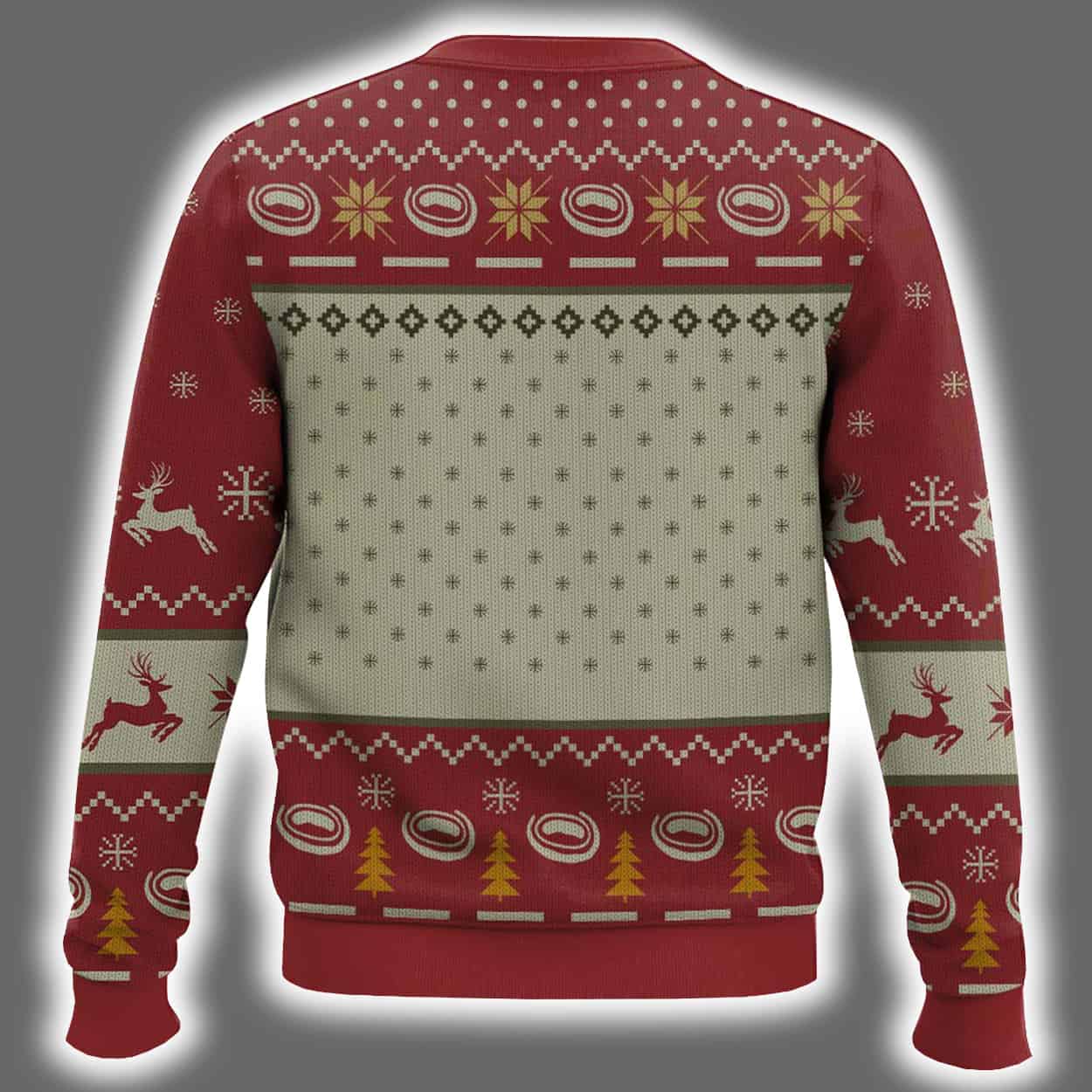Embark on a cozy quest with this sweater, a must-have for cat lovers and fantasy fans alike. This charming red and beige sweater features adorable cat versions of your favorite Fellowship characters (Frodo, Aragorn, Gandalf, etc.), styled in a delightful lineup below the cheekily reimagined title, “Lord of the Cats: The Fellowship of the Kitty,” written in classic Lord of the Rings font. The sweater is adorned with festive zigzag patterns, snowflakes, and Christmas trees, while playful paw prints and fish bones add a feline twist. The back continues the holiday magic with matching motifs, minus the central character illustrations.