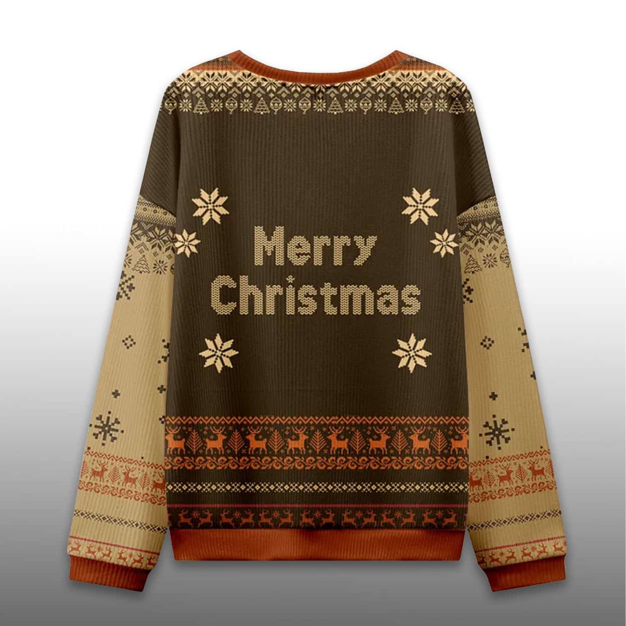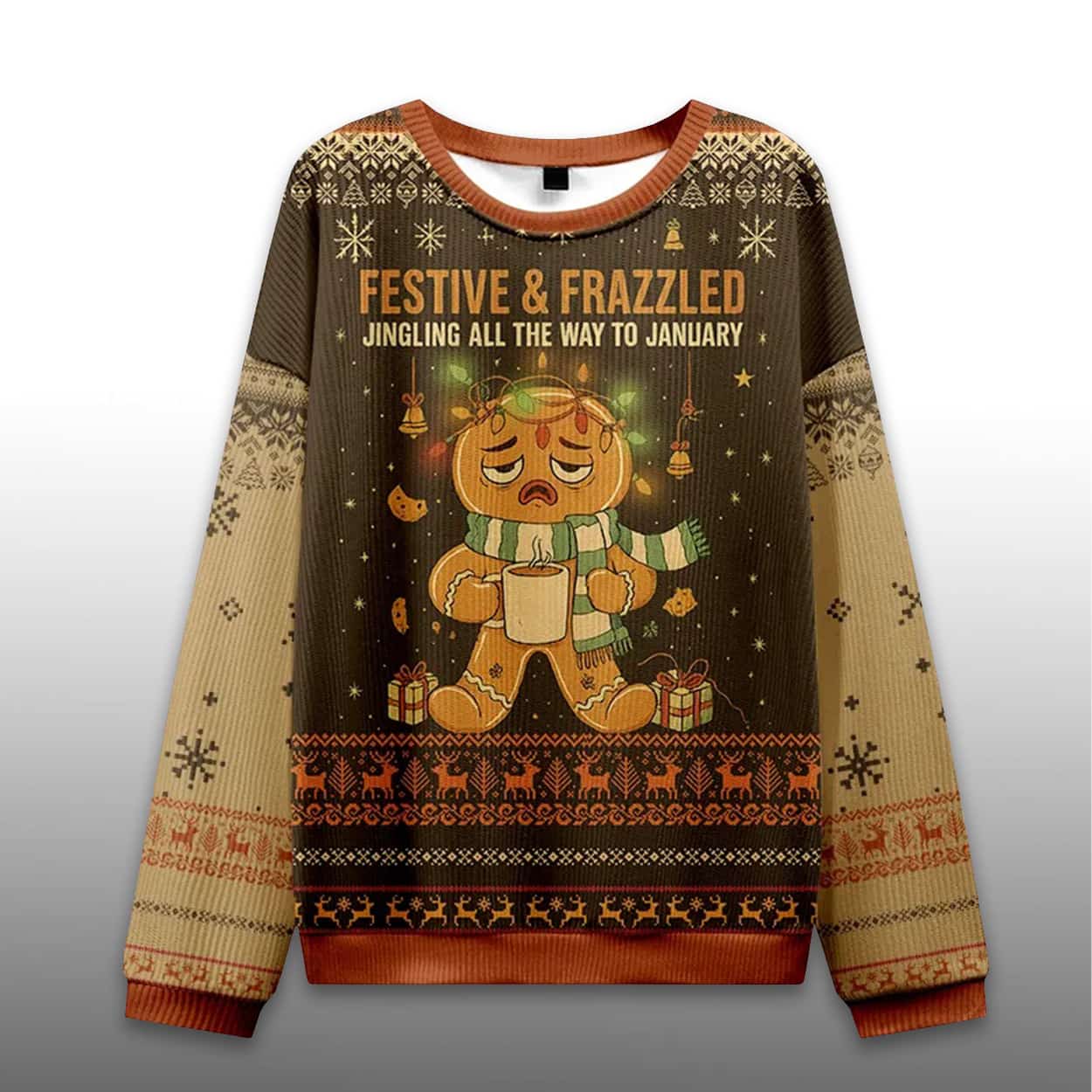 This humorous holiday sweater features a relatable design that captures the spirit of the Christmas rush. The key graphic is a tired, strung-out gingerbread man wrapped in Christmas lights, holding a warm beverage. Above him is the text “FESTIVE & FRAZZLED / JINGLING ALL THE WAY TO JANUARY”. The design utilizes traditional holiday colors and patterns, including reindeer and snowflakes, with a large “Merry Christmas” message across the back.