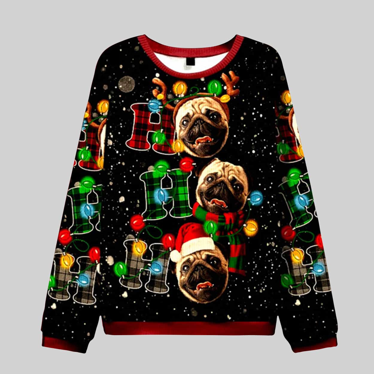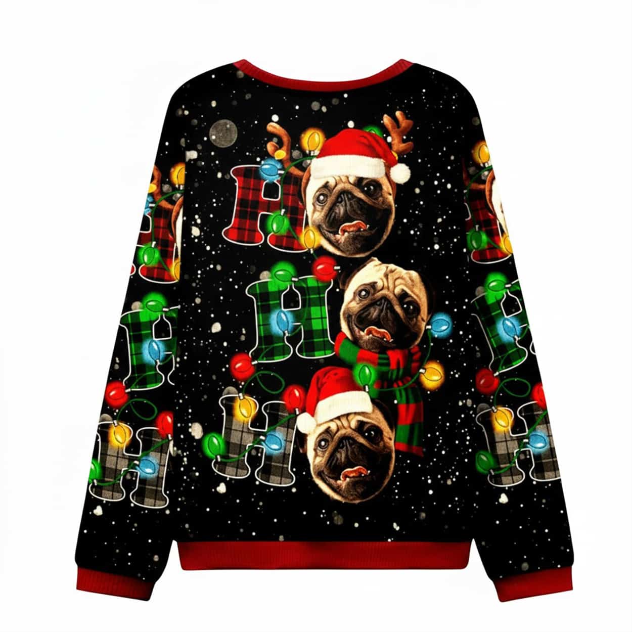 This holiday pullover is the perfect “pug-ly” Christmas sweater, combining holiday cheer with adorable, chaotic canine energy. The festive black sweater features a bright red trim and is lit up by a design of colorful Christmas lights. The “HO HO HO” is stacked vertically, with the “H”s made of festive plaid, and the “O”s hilariously replaced by three different, very festive pugs—one in reindeer antlers, one in a scarf, and one in a Santa hat.