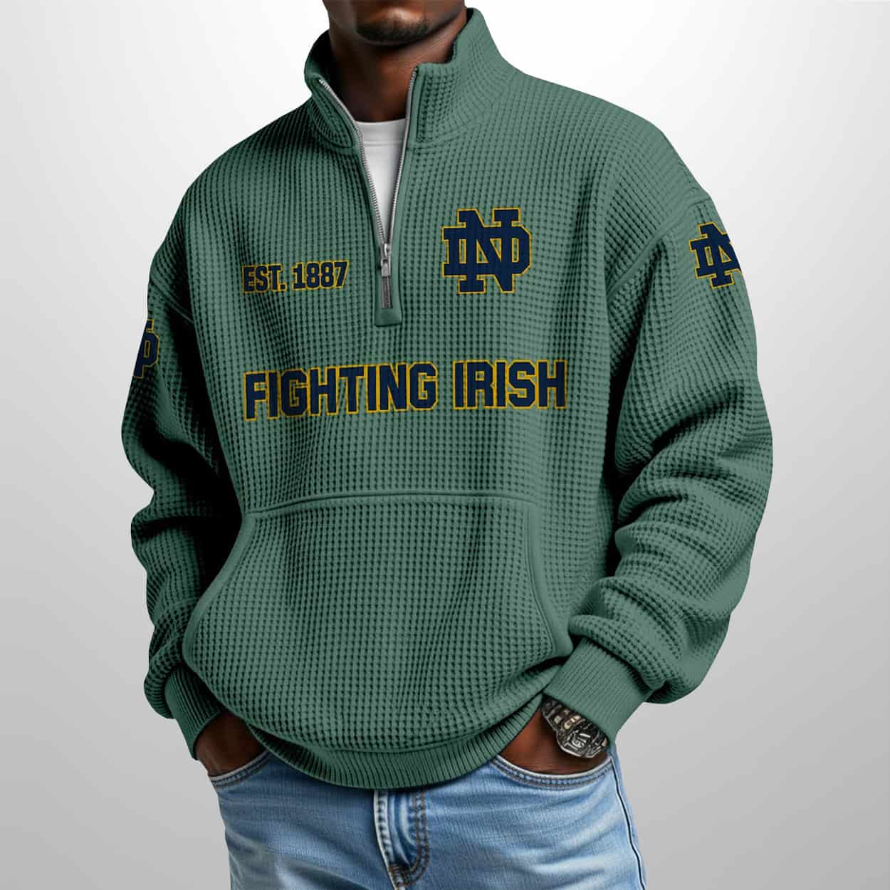 Ready to wear your Irish pride with punch and polish? Zip into the Fighting Irish Est 1887 Waffle Stand Collar Half Zip Sweatshirt and let your style speak volumes. Victory starts with what you wear.