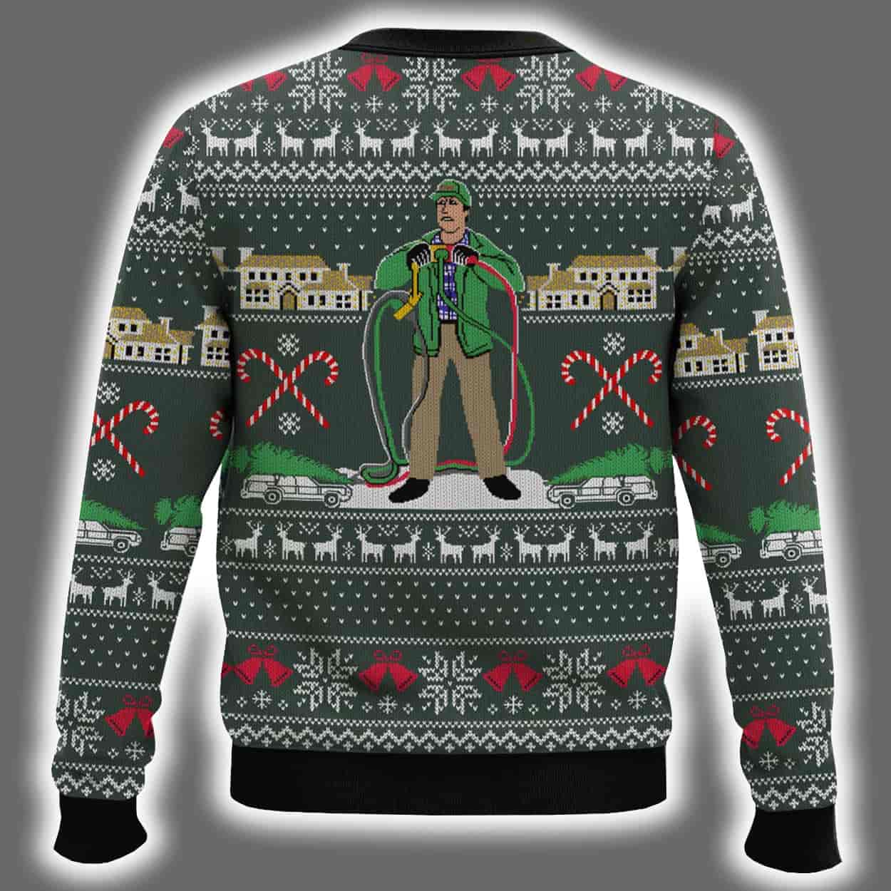 This sweater is a glorious tribute to one of the most hilariously chaotic moments in holiday movie history. Front and center, you’ll find a determined dad—hose in hand—standing proudly before a house ablaze with Christmas lights. Surrounding him are snowflakes, candy canes, and Christmas trees, all arranged in a delightfully tacky pattern that screams “ugly sweater” in the best way possible. The bold white text at the bottom reads FIRE IT UP DAD!, capturing the spirit of a man on a mission to make the season bright. The design wraps around to the back, ensuring your festive flair is visible from every angle.