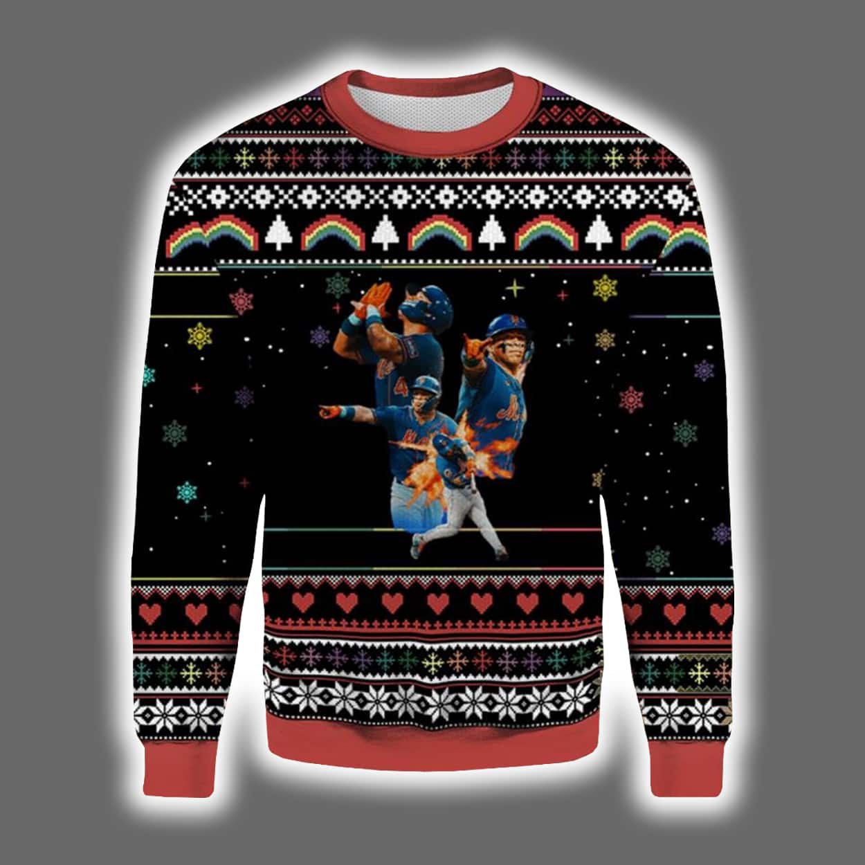 Deck the halls—and yourself—with this wildly festive sweater. Featuring a vibrant mashup of holiday motifs like snowflakes, hearts, and Christmas trees in classic red, green, white, and black, this sweater screams celebration. But the real MVP? A dynamic graphic of four Mets players mid-action, decked out in blue and orange uniforms, with Francisco Alvarez front and center. Set against a black backdrop sprinkled with multicolored stars and snowflakes, this sweater turns every room into a stadium of joy.