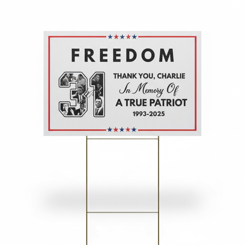 Make a statement that’s both personal and patriotic with the Freedom Thank You Charlie In Memory Of A True Patriot Yard Sign. Framed in a striking red border and flanked by rows of blue stars, this sign proudly declares “FREEDOM” above a heartfelt message: “THANK YOU, CHARLIE – In Memory Of A TRUE PATRIOT.” The years 1993–2025 mark a life lived with purpose, and the bold number “31” steals the show—filled with black-and-white snapshots that evoke military service, camaraderie, and national pride.