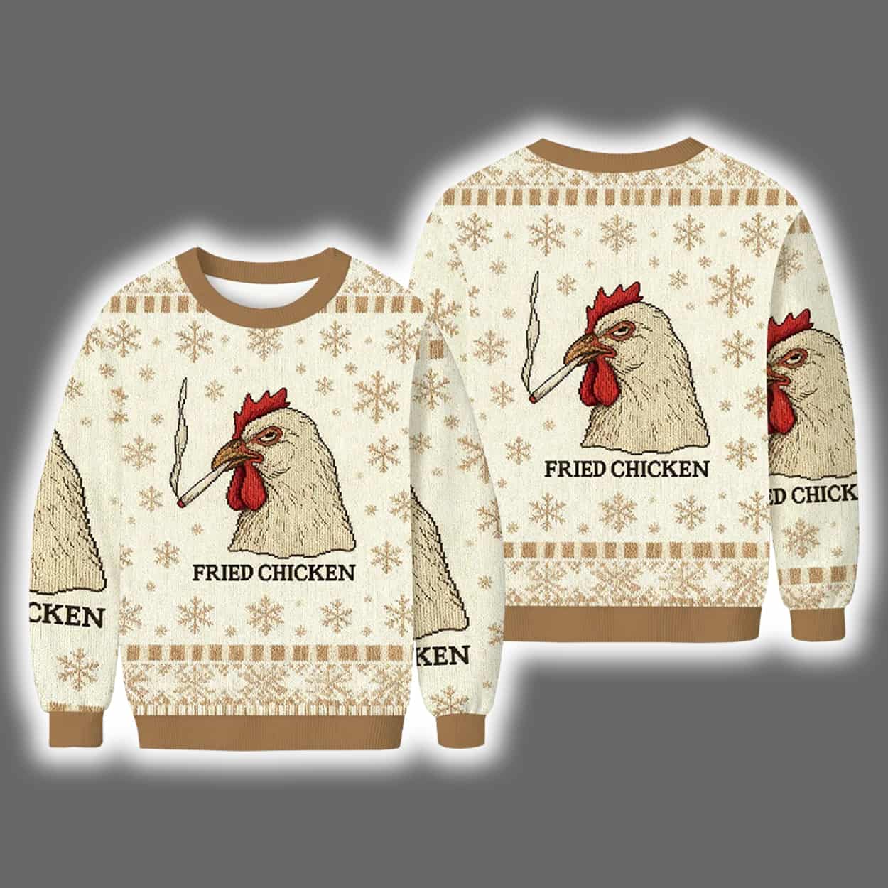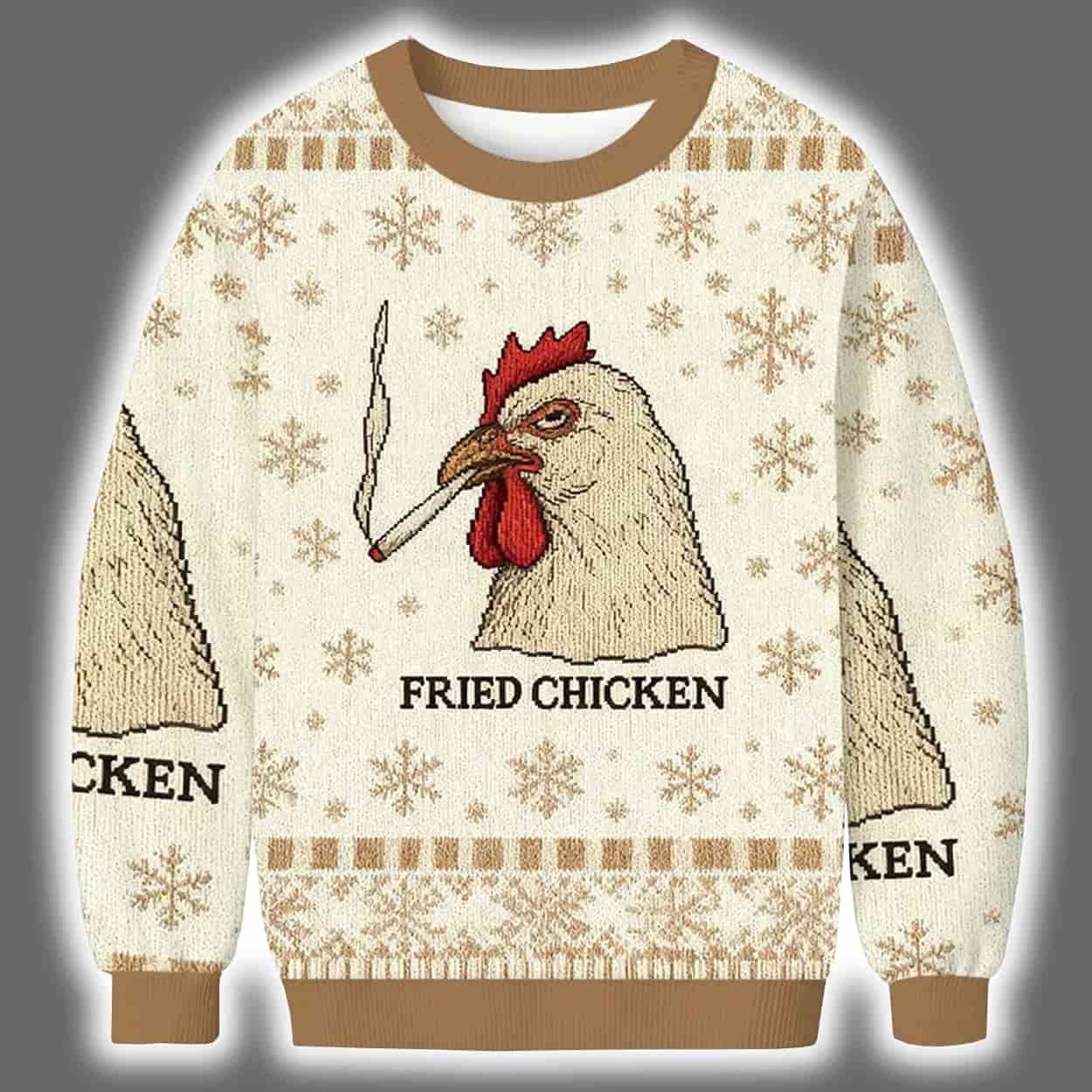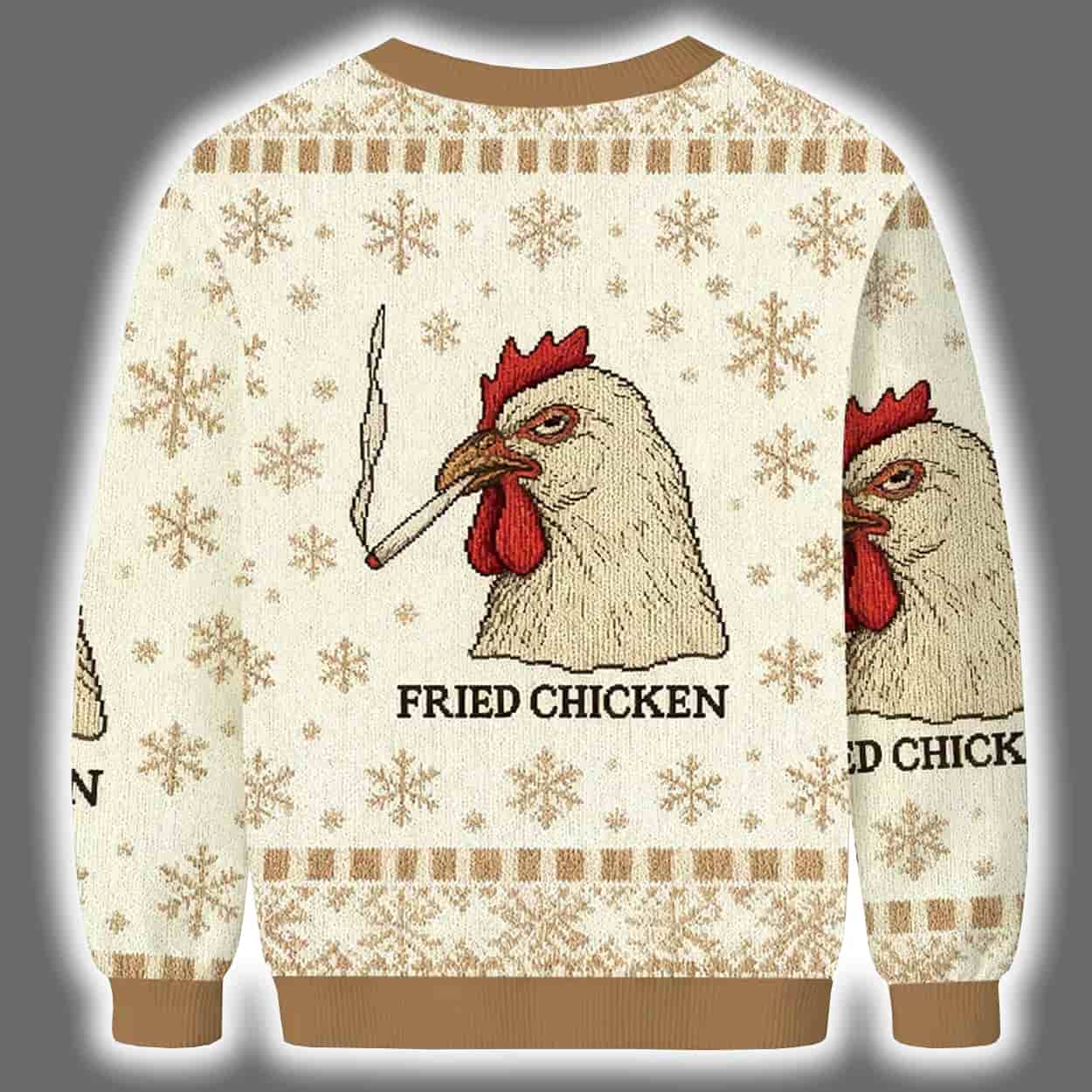 Get ready to ruffle some feathers this holiday season with a sweater that’s anything but traditional. Featuring a beige and brown festive backdrop sprinkled with snowflakes and geometric patterns, this sweater sets the scene for its star attraction: a bold, unapologetic chicken puffing on a cigarette. With its red comb and wattle standing proud, this bird means business. Beneath the illustration, the phrase “FRIED CHICKEN” adds a deliciously ironic twist, making this sweater a hilarious head-turner from every angle—front and back.