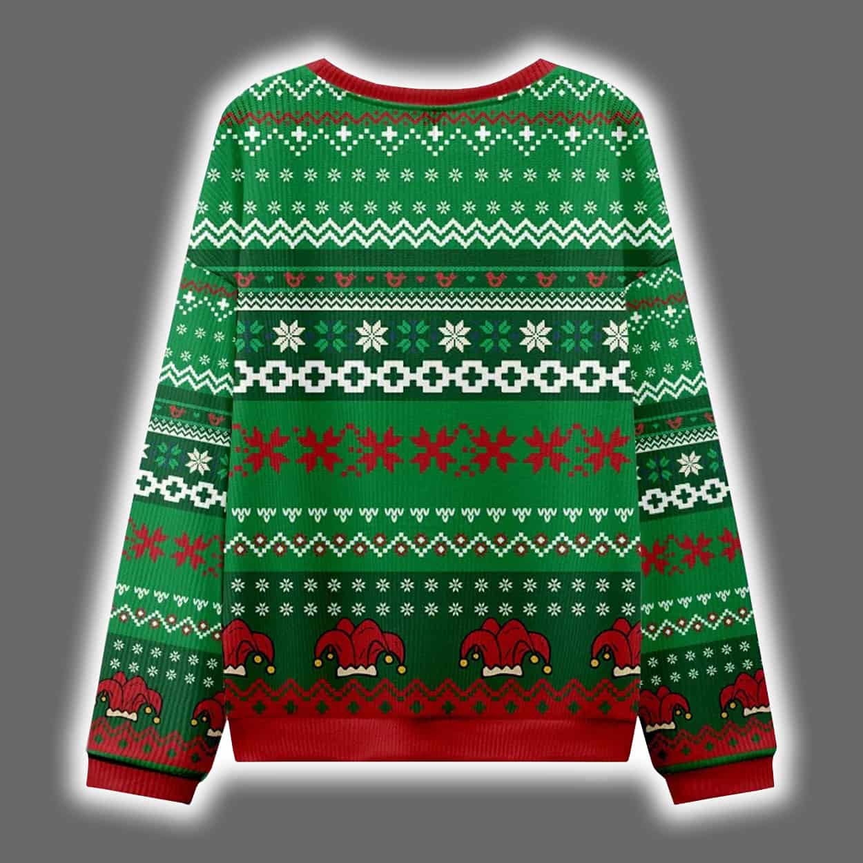 This sweater is a feast for the eyes and a celebration of holiday absurdity. Front and center is a quirky green elf-like frog character, decked out in a red-and-white jester hat and wielding a giant candy cane like a ladle. Beside him bubbles a mysterious cauldron, from which a ghostly white figure rises—perhaps the spirit of Christmas snacks past? The backdrop is a vibrant tapestry of snowflakes, reindeer, and geometric holiday patterns in classic red, green, and white. The back continues the festive motif, keeping the energy high even when you turn around. It’s a wearable storybook of seasonal silliness.