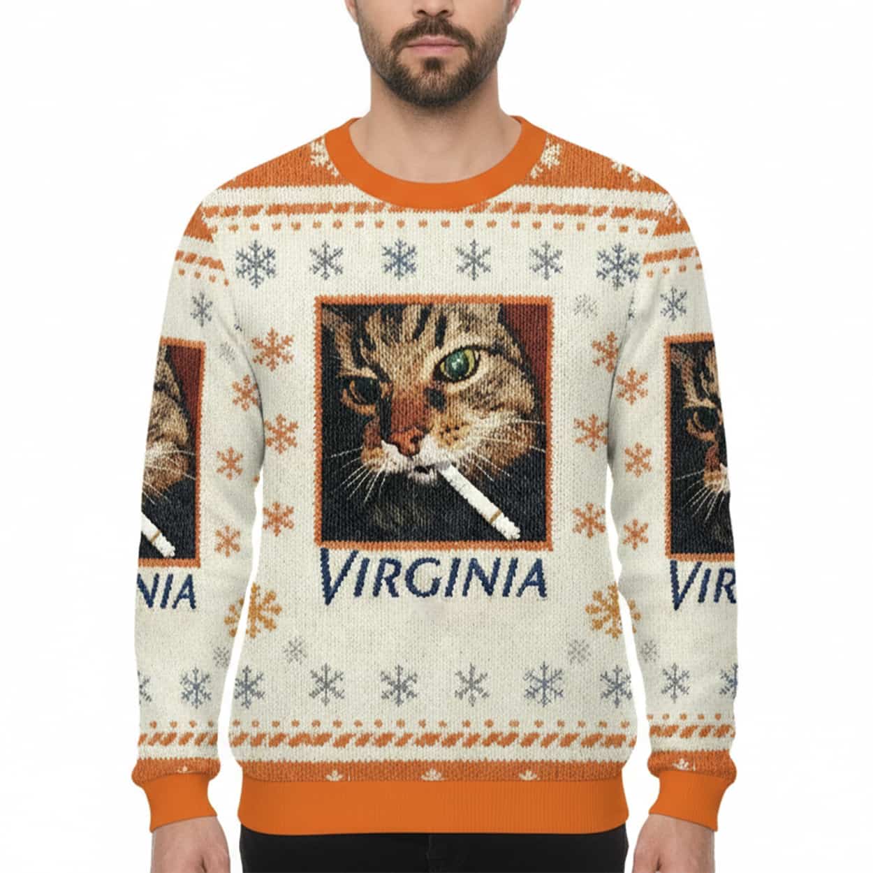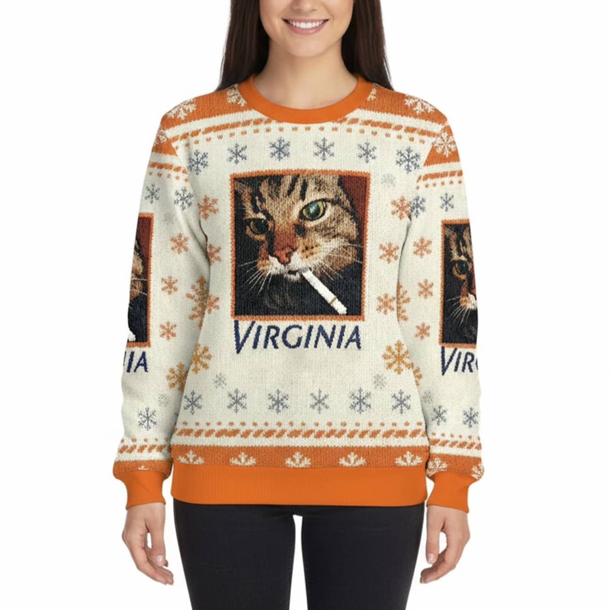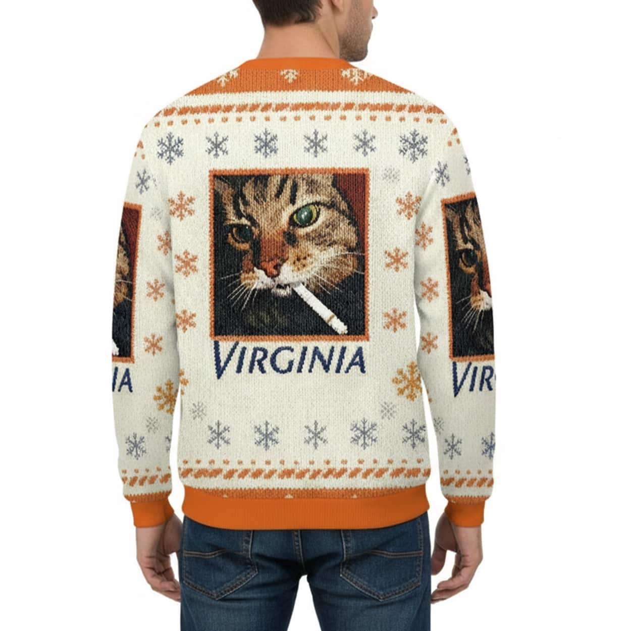 Step aside, traditional holiday wear — this sweater is here to stir the punch and steal the spotlight. Featuring a close-up of a cat with a cigarette dangling from its mouth, this sweater delivers peak internet absurdity wrapped in festive flair. The feline’s deadpan expression is framed in a rectangular border, sitting proudly above the bold, capitalized word “VIRGINIA.” Snowflakes in orange, blue, and gray scatter across the cream background, while vibrant orange accents on the cuffs, collar, and hem add a pop of contrast. It’s weird, it’s wonderful, and it’s guaranteed to spark conversation.