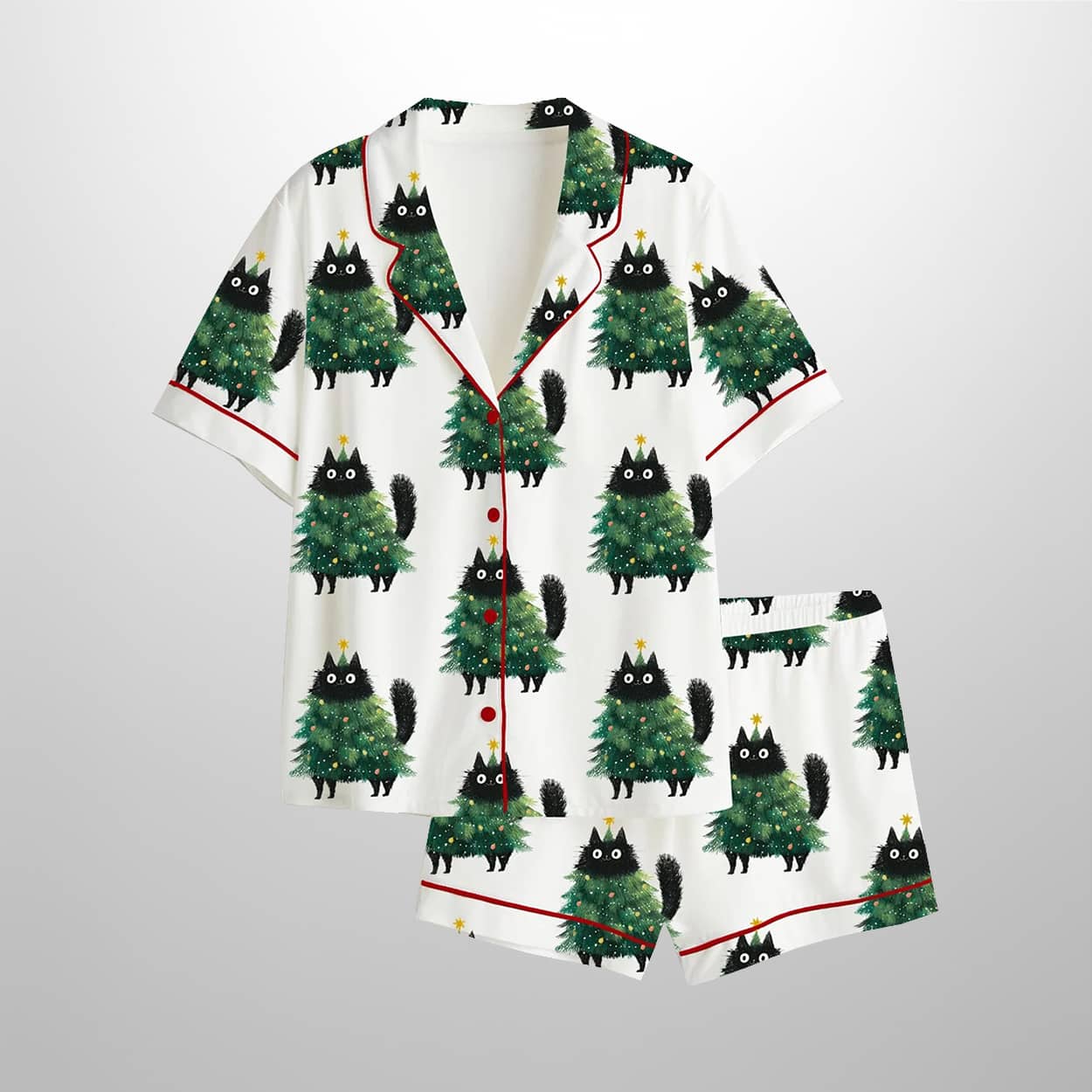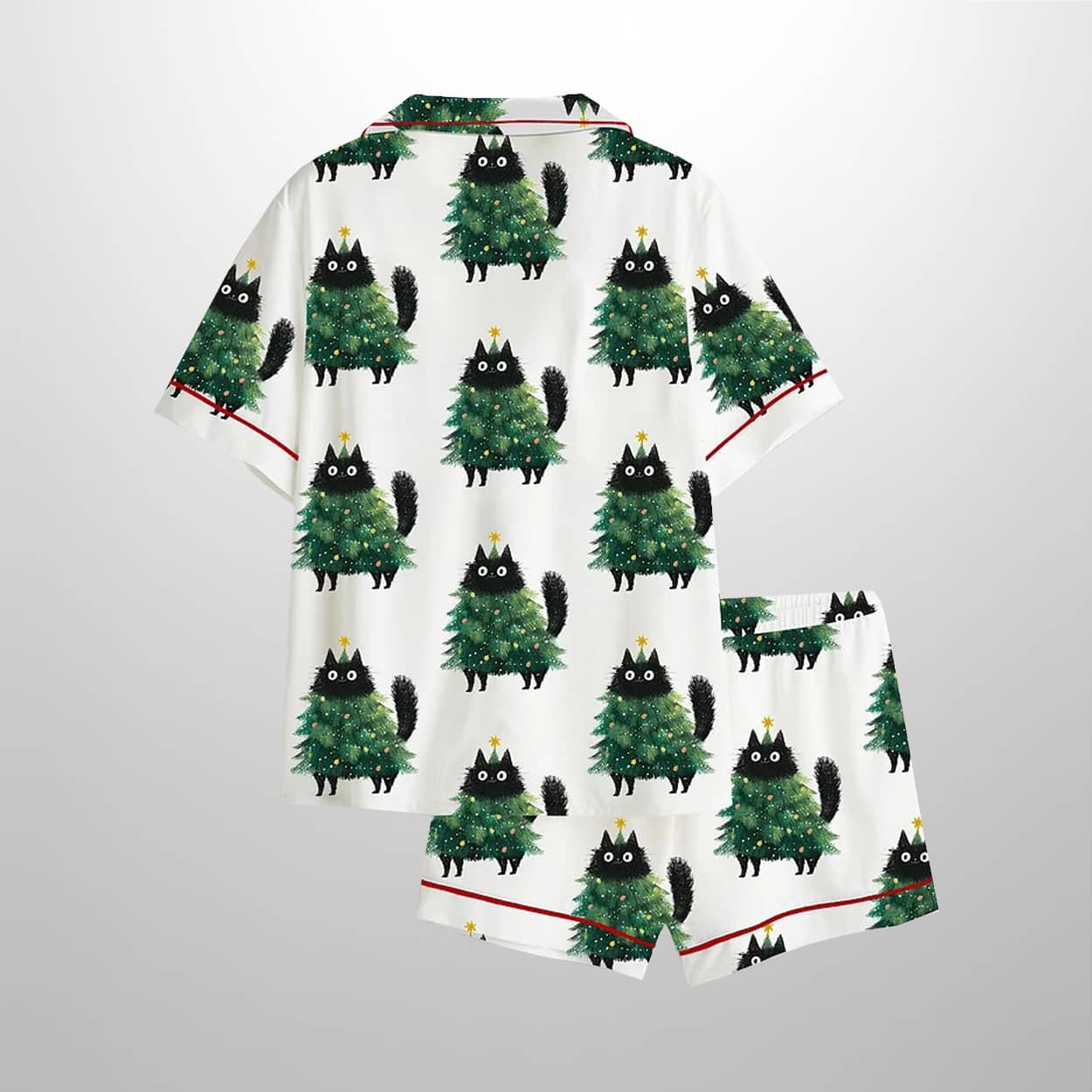 Get ready to sleigh bedtime style with this pajama set. This cheeky two-piece includes a short-sleeved button-up top and matching shorts, both decked out in a delightfully quirky print. Black cats with wide yellow eyes peek mischievously from inside green Christmas trees, creating a scene that’s equal parts festive and feline. Red piping and buttons add a pop of holiday color, framing the playful design with a classic touch.