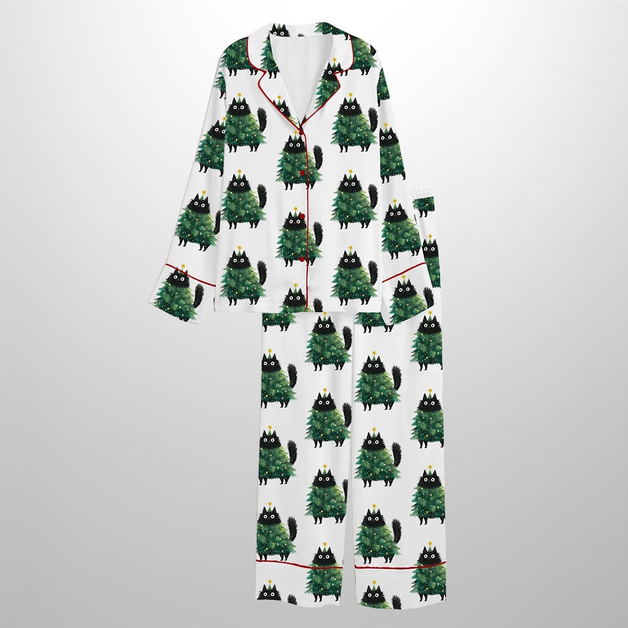 Funny Christmas Cat In Tree Costume Cute Holiday Satin Pajama Set – Holiday Humor Meets Cozy Charm