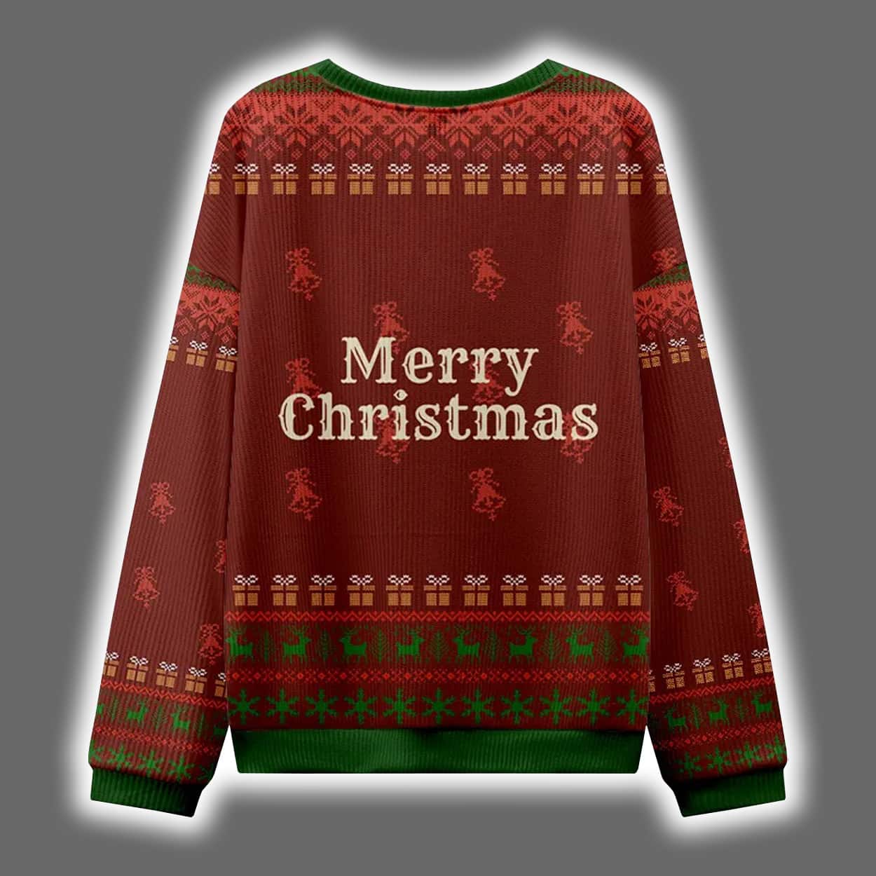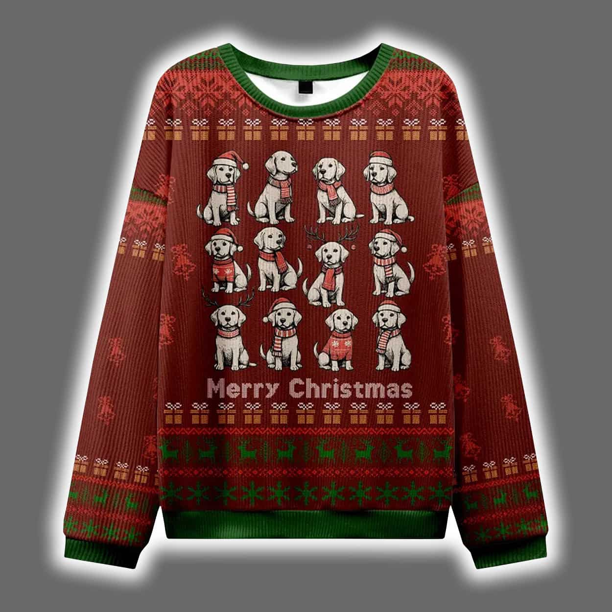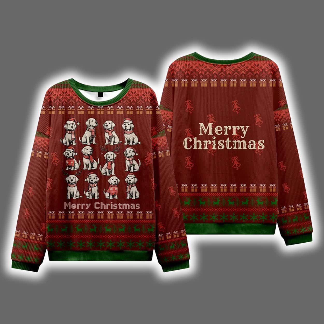 Get ready to sleigh the holiday season with this outrageously adorable Christmas sweater! The front showcases twelve cartoon-style dogs decked out in Santa hats and cozy scarves, arranged in three cheerful rows. Each pup brings its own personality to the party, from the sleepy spaniel to the mischievous mutt. Beneath this canine chorus, the phrase “Merry Christmas” pops in bold white lettering. The back keeps the festive spirit alive with a matching “Merry Christmas” message surrounded by classic holiday motifs—snowflakes, reindeer, and decorative borders in red, green, and white.