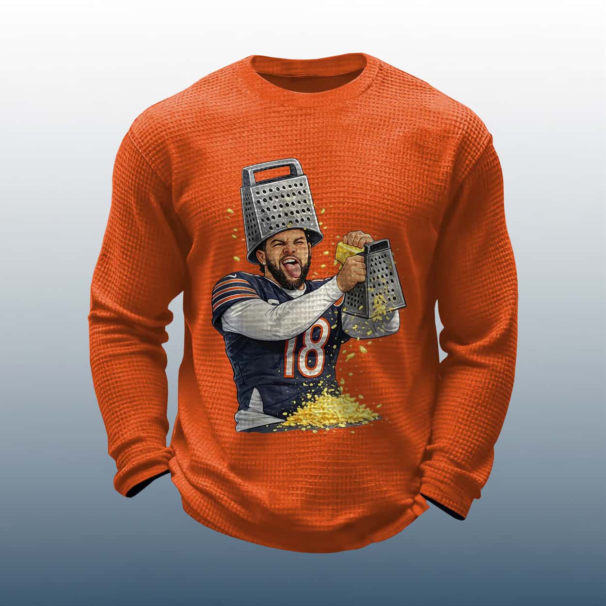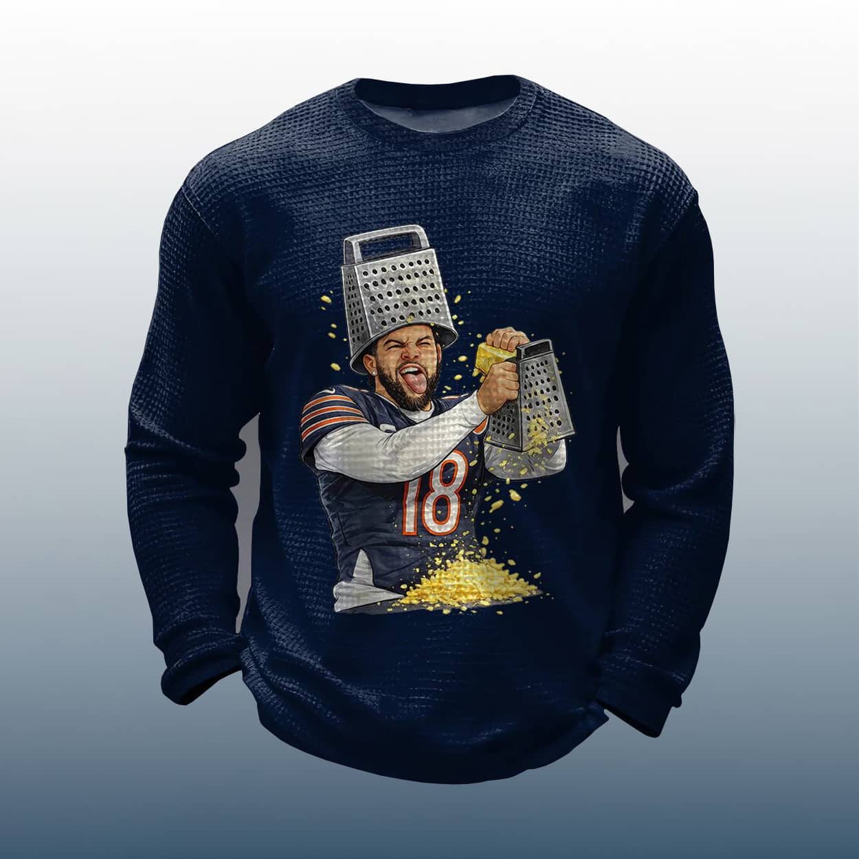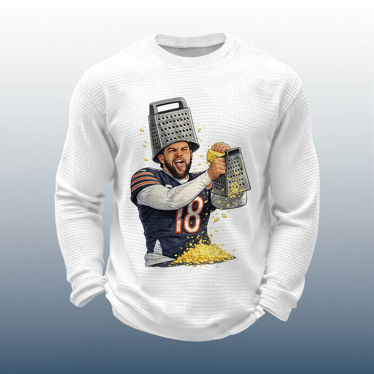 Celebrate football fandom with a hilarious twist—Caleb Williams grates cheese in this Funny Football Caleb Williams Grating Cheese Waffle Long Sleeve Shirt that playfully trolls Packers fans. A must-have for Bears supporters with a sense of humor.