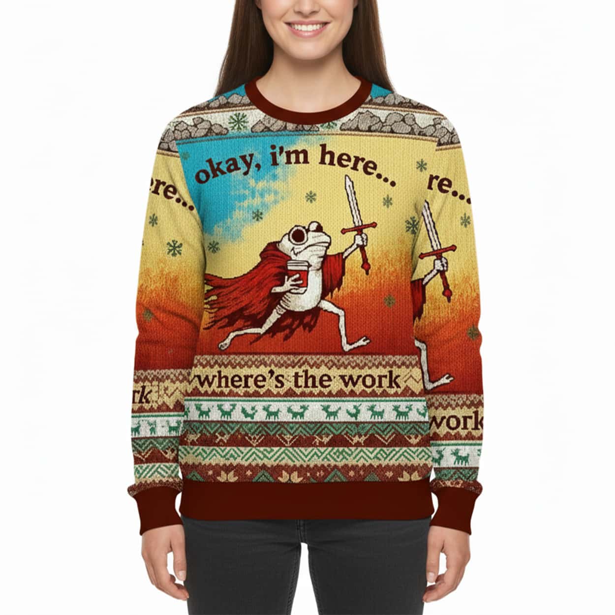 Make an entrance this holiday season with the Funny Frog Okay I’m Here Where’s The Work Ugly Christmas Sweater—perfect for festive slackers and dramatic arrivals.