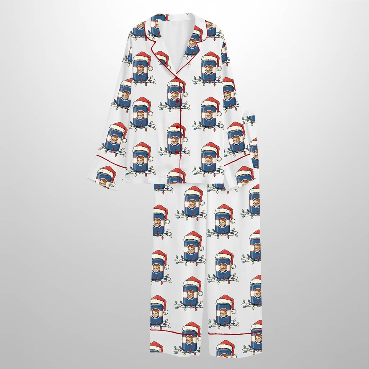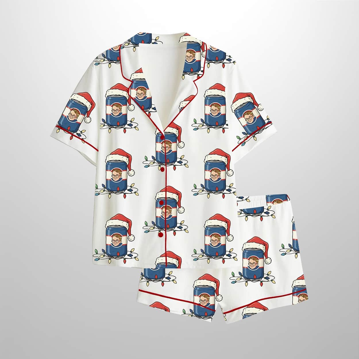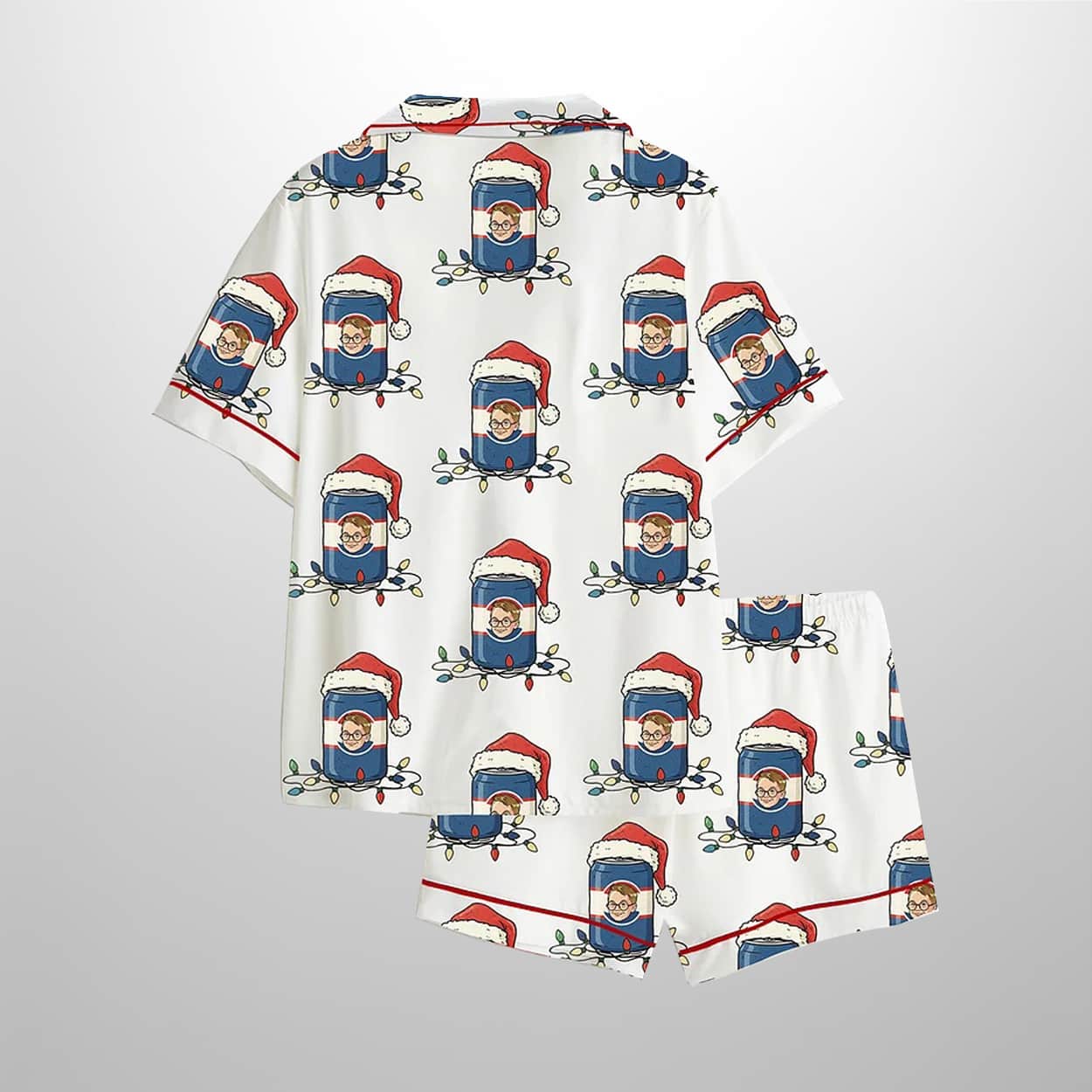Bring the holiday chaos of your favorite Christmas classic to your sleepwear with this pajama set. This cheeky ensemble includes a short-sleeved button-up shirt and matching shorts, both splashed with a festive print of cartoon-style characters channeling mischievous holiday vibes. Each character rocks a Santa hat and candy canes, striking poses that scream “holiday troublemaker.” The crisp white background lets the playful design shine, while bold red piping along the collar, button line, sleeves, and hems adds a pop of seasonal flair. It’s a pajama set that’s equal parts cozy and comical.