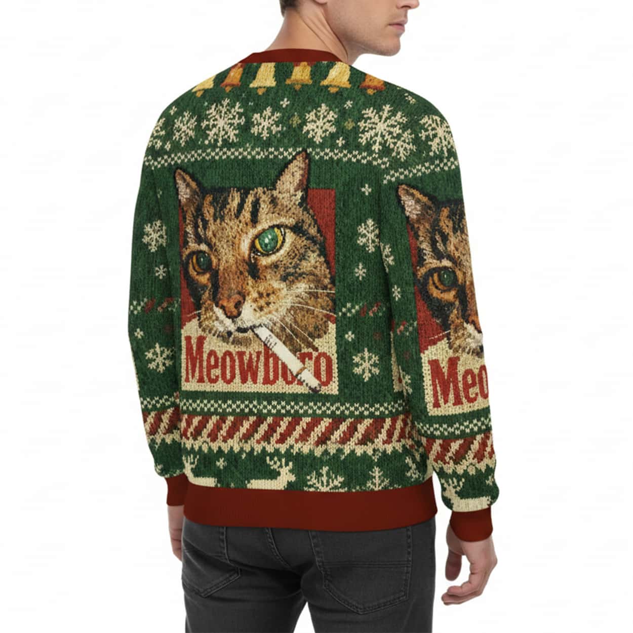 Turn heads and spark laughter with this unapologetically quirky Christmas sweater. Dominated by a green backdrop and festive patterns of snowflakes, trees, and bells, the centerpiece is a cat with piercing green eyes and a cigarette dangling from its mouth. Beneath the feline rebel is the word “Meowboro,” a cheeky parody of the iconic Marlboro logo. The design repeats across the sweater, creating a symmetrical, eye-catching look that blends holiday cheer with meme-worthy mischief.