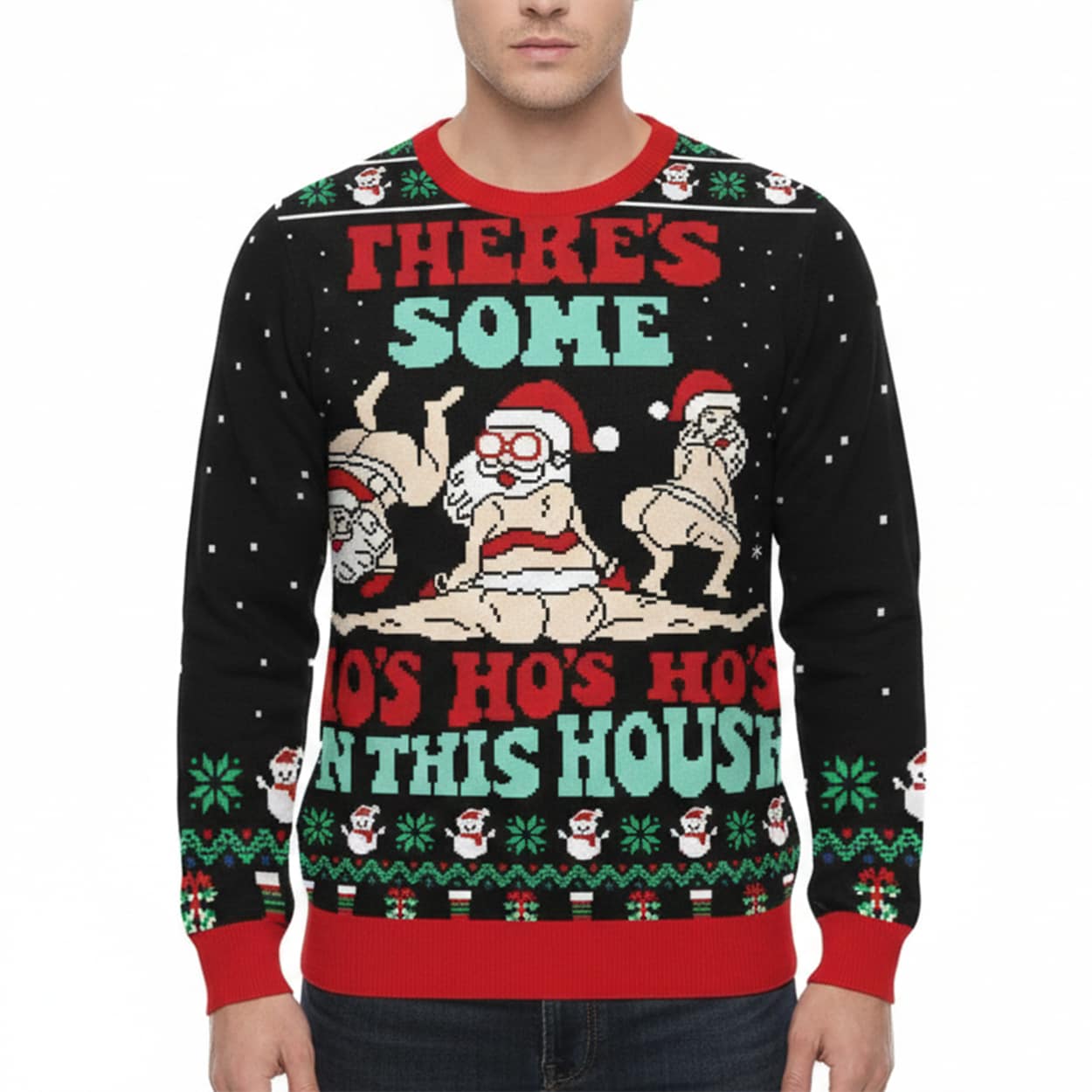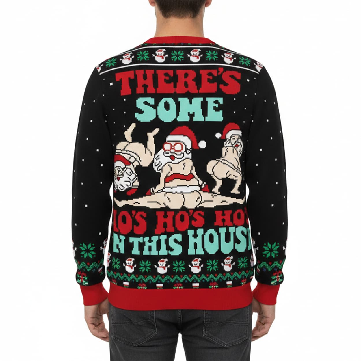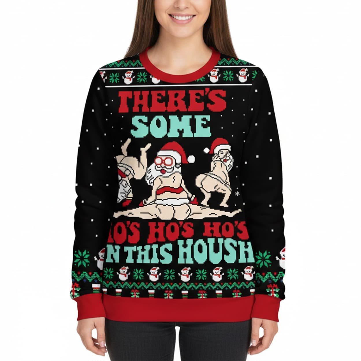 Turn up the holiday heat with this sweater — a bold twist on classic Christmas cheer. This sweater bursts with red, green, and white accents, featuring snowflakes, festive borders, and a crew of cartoon Santas rocking shades and serious attitude. The centerpiece? A hilarious remix of a familiar phrase: “THERE’S SOME HO’S HO’S HO’S IN THIS HOUSE,” printed loud and proud across the chest. With red cuffs and waistband to match the sass, this sweater is built for those who like their holiday spirit with a side of humor.