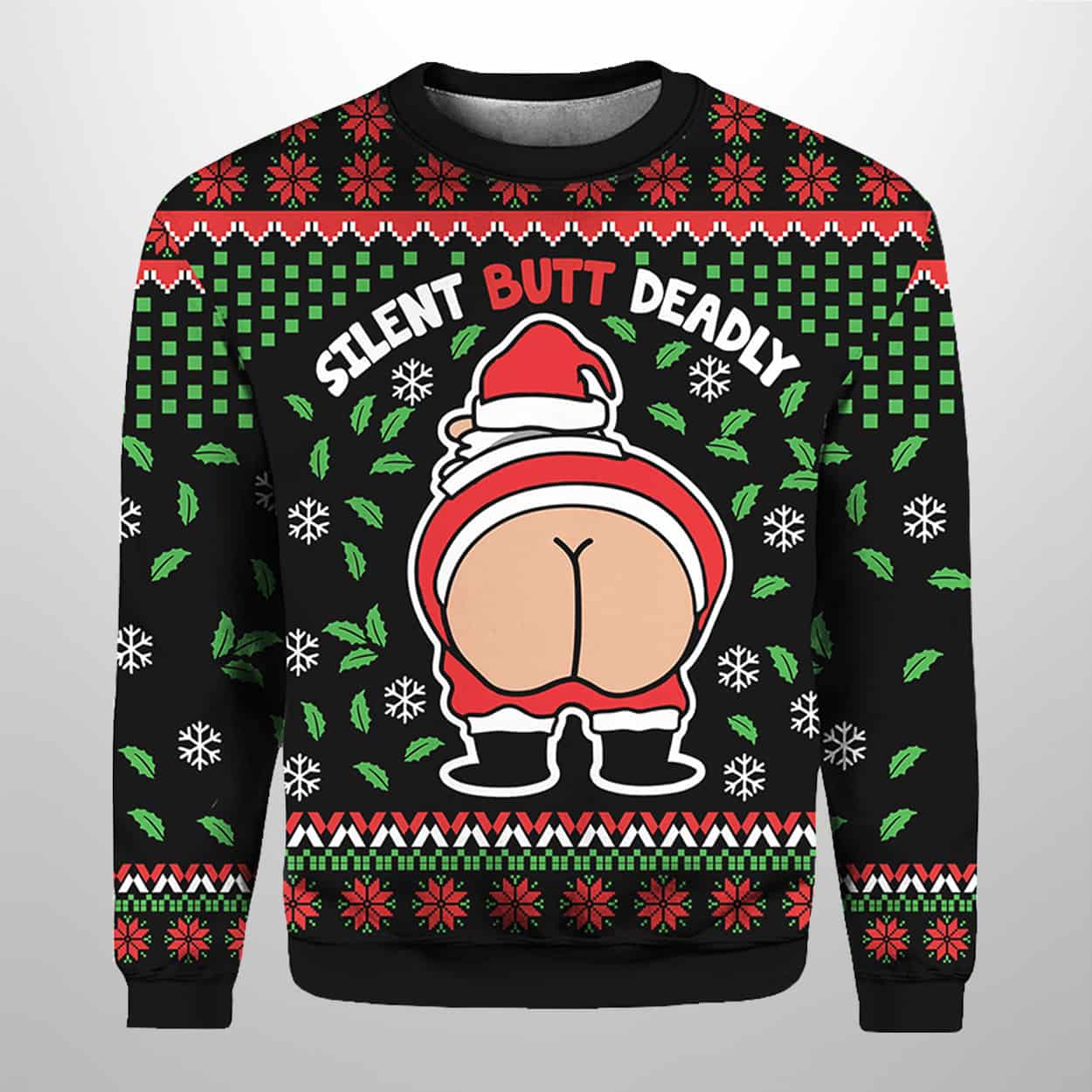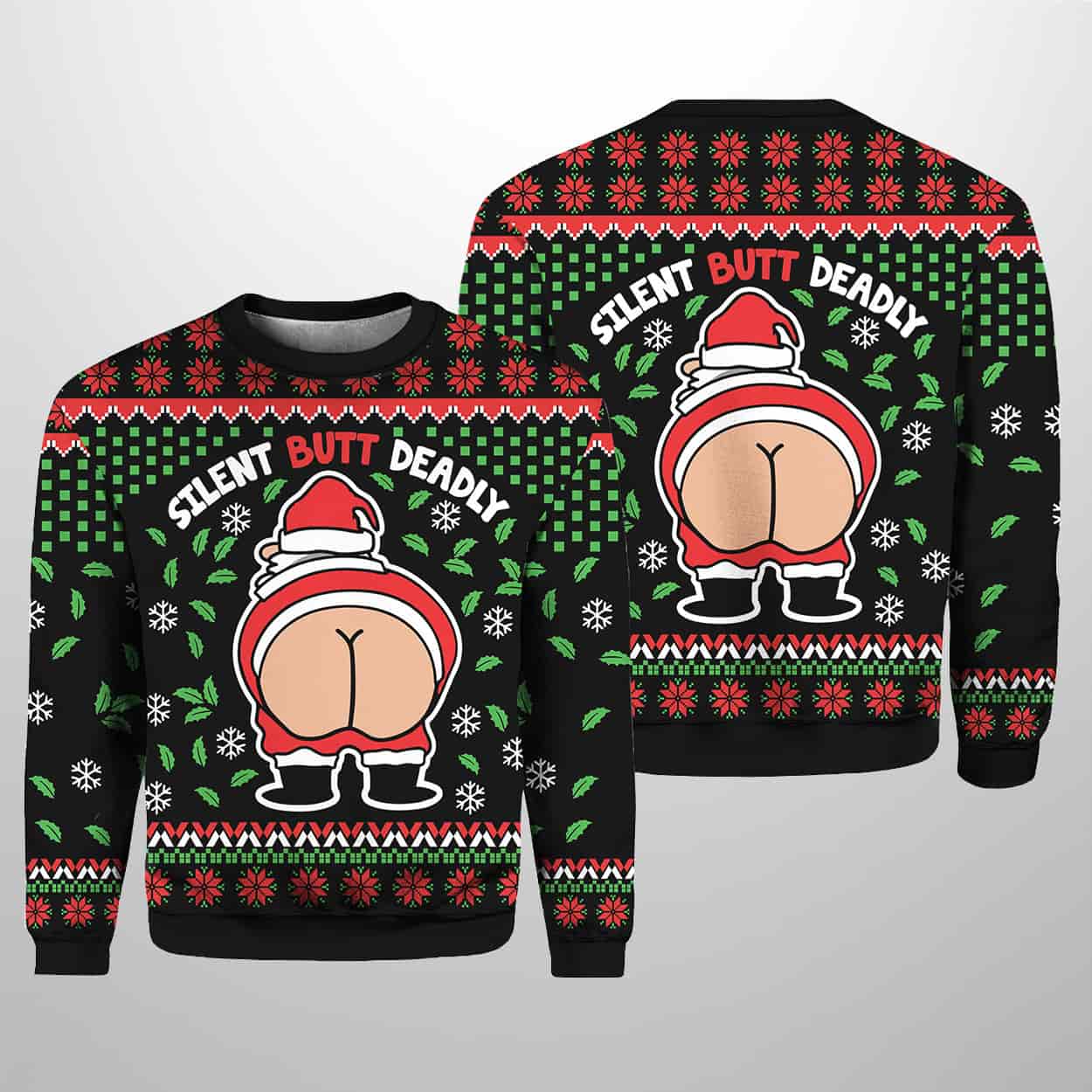 Get ready to jingle all the way into laughter with this sweater. This festive green sweater features a cartoon Santa from behind, mooning the season with exaggerated bare cheeks and a mischievous grin. Surrounded by snowflakes, holly leaves, and classic Christmas patterns in red, white, and green, the design is topped off with bold text that reads: “SILENT BUTT DEADLY.” Both front and back showcase the same hilariously cheeky scene, making this sweater a guaranteed conversation starter at any holiday gathering.