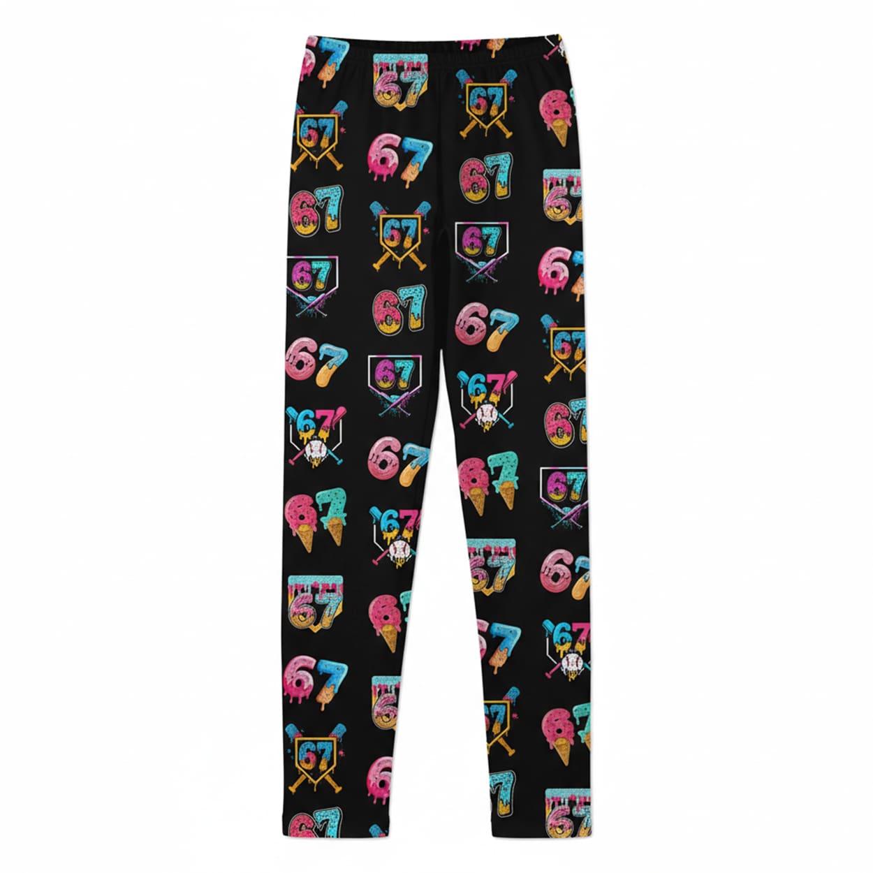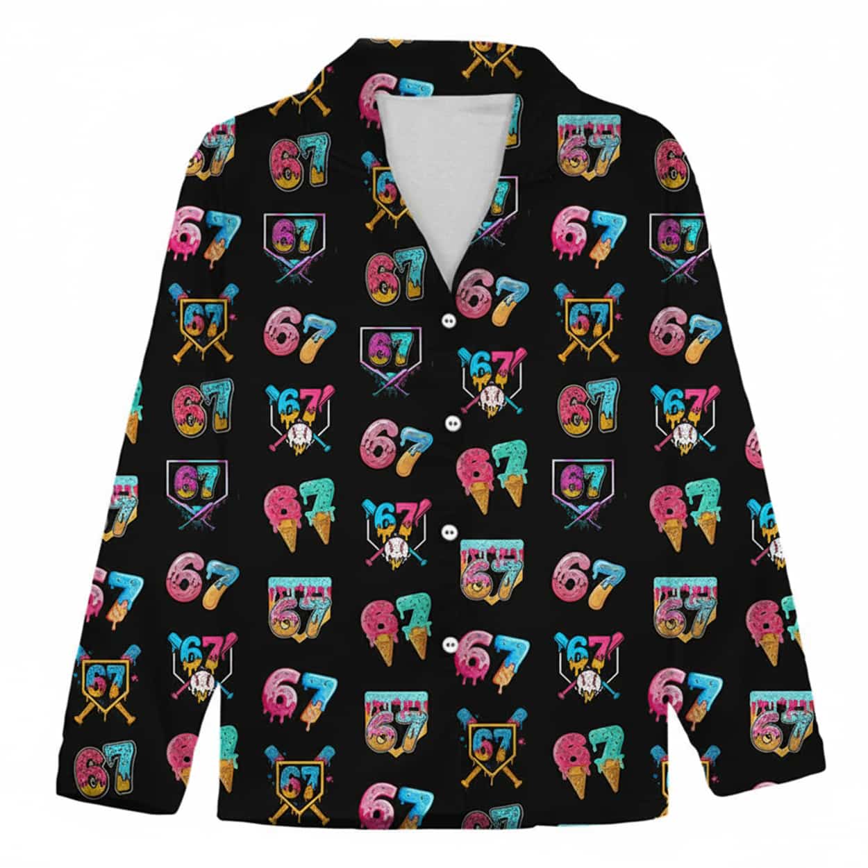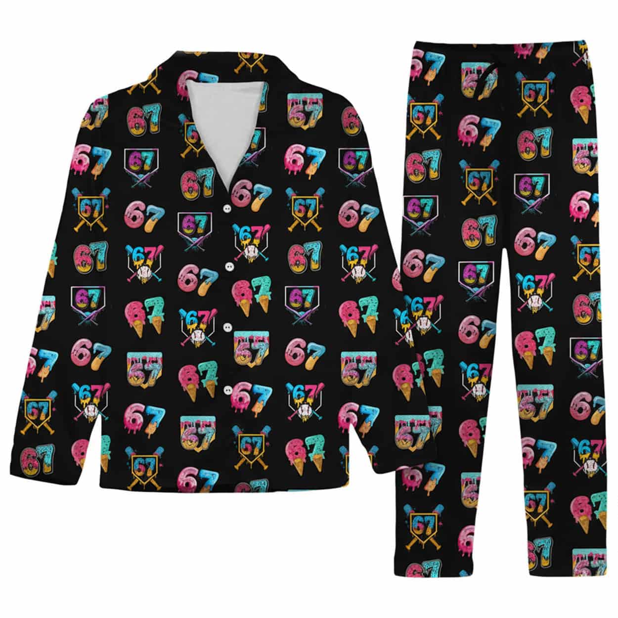 This pajama set features a kaleidoscope of vibrant graphics: smiling ice cream cones, crossed baseball bats, shield emblems, and the cryptic combo “6 7” repeated like a mantra. The colors pop—pink, blue, yellow, green, purple—like a sugar rush on fabric. It’s cozy, it’s weird, and it’s unapologetically meme-worthy. Whether you interpret “6 7” as a countdown to absurdity or a reference to something deeper, this set invites speculation and snickers.