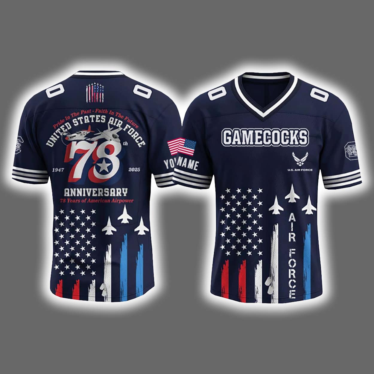This jersey is a tribute that wears its pride on every stitch. With a deep blue backdrop, this commemorative piece features bold white “GAMECOCKS” lettering across the chest, flanked by the U.S. Air Force logo and a personalized patch that reads “YOU NAME.” The front and back showcase ascending fighter jet silhouettes in red, white, and blue—because this jersey doesn’t just honor history, it soars with it. On the reverse, “78 ANNIVERSARY” is emblazoned in star-spangled style, framed by the years “1947” and “2025,” with the phrase “To Protect and Defend” anchoring the message. A small American flag and “UNITED STATES AIR FORCE” seal the salute.